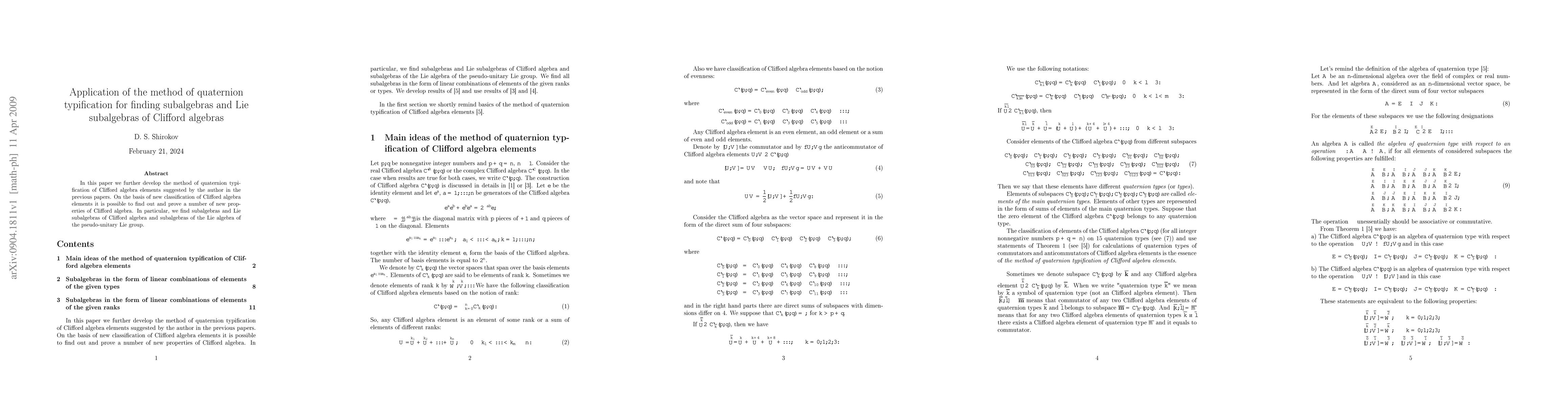 This paper refines the method of quaternion typification to classify Clifford algebra elements, unveiling new properties and identifying subalgebras and Lie subalgebras of Clifford algebras and the pseudo-unitary Lie group's Lie algebra.