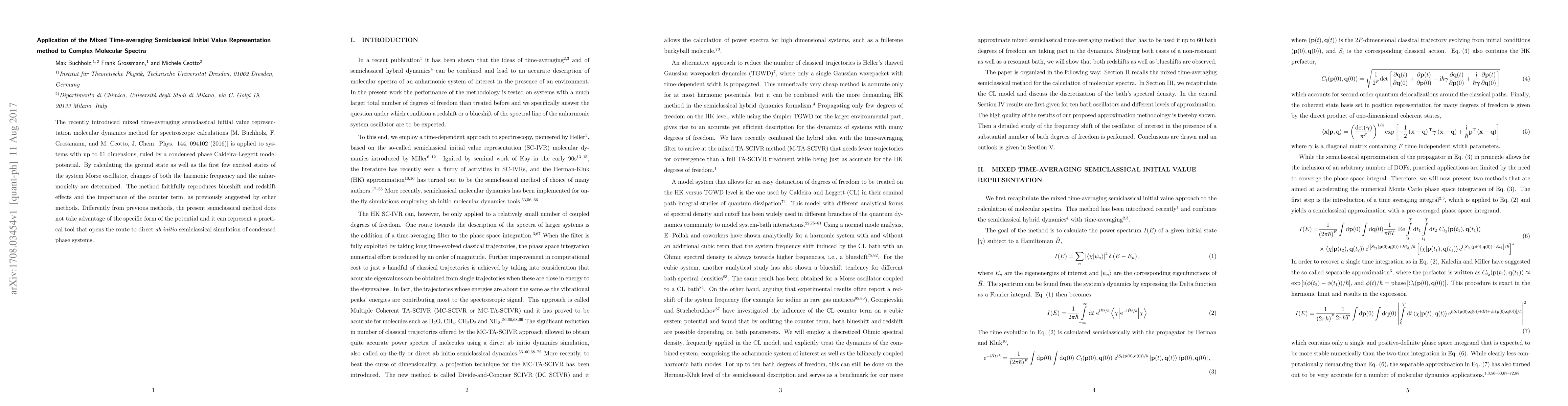 This paper applies a mixed time-averaging semiclassical initial value representation method to complex molecular spectra, demonstrating its effectiveness in modeling up to 61-dimensional systems. The method accurately reproduces blueshift and redshift effects and shows the potential for direct ab initio semiclassical simulation of condensed phase systems.