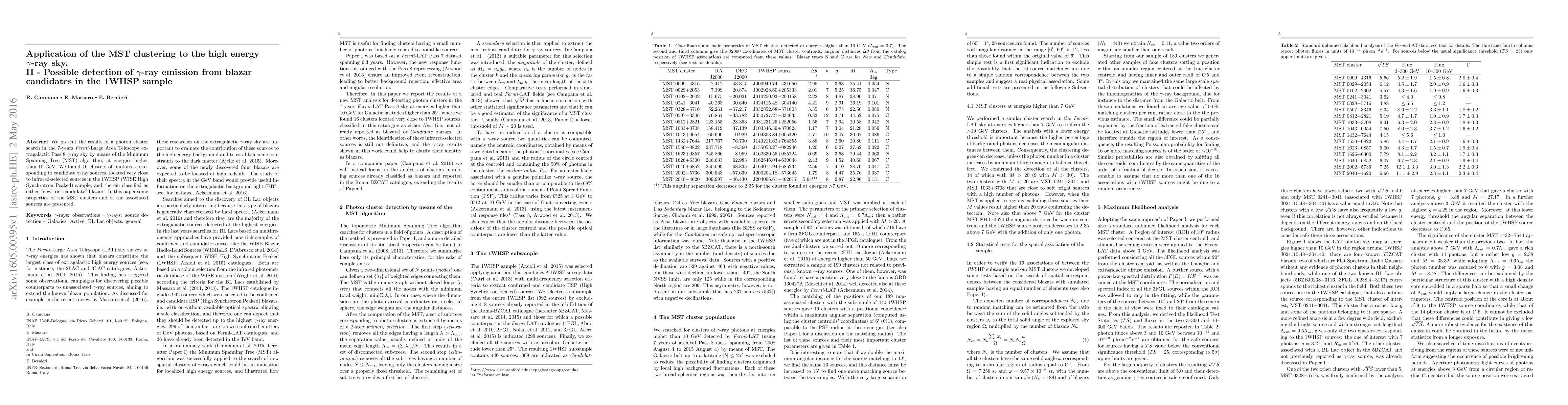 We present the results of a photon cluster search in the 7-years Fermi-Large Area Telescope extragalactic Pass 8 gamma-ray sky by means of the Minimum Spanning Tree (MST) algorithm, at energies higher than 10 GeV. We found 16 clusters of photons, corresponding to candidate gamma-ray sources, located very close to infrared-selected sources in the 1WHSP (WISE High Synchrotron Peaked) sample, and therein classified as either "new" or "candidate" blazars. In this paper some properties of the MST clusters and of the associated sources are presented.
