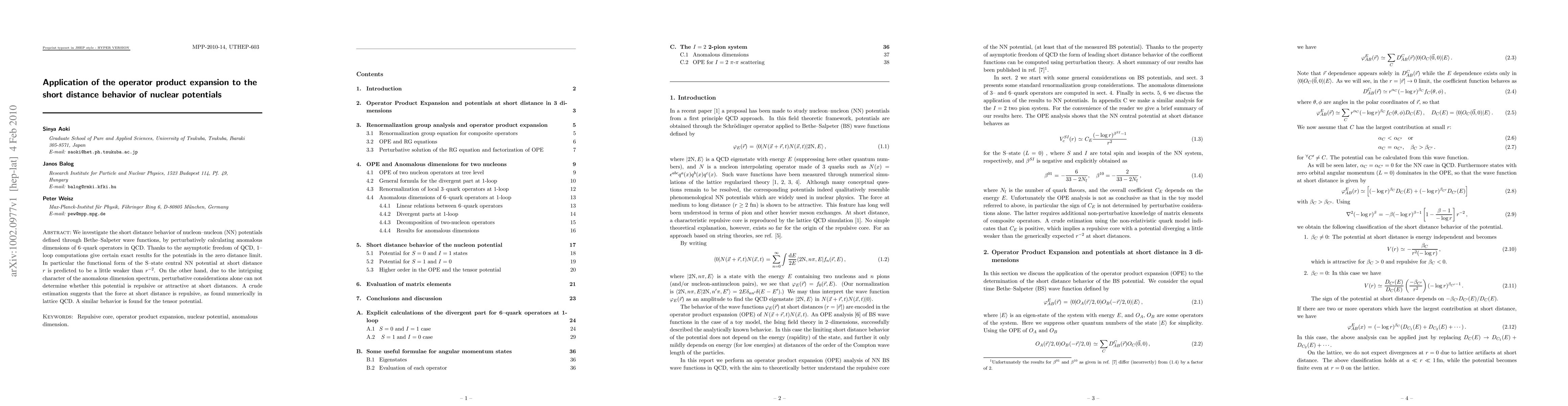 We investigate the short distance behavior of nucleon-nucleon (NN) potentials defined through Bethe-Salpeter wave functions, by perturbatively calculating anomalous dimensions of 6-quark operators in QCD. Thanks to the asymptotic freedom of QCD, 1-loop computations give certain exact results for the potentials in the zero distance limit. In particular the functional form of the S-state central NN potential at short distance $r$ is predicted to be a little weaker than $r^{-2}$. On the other hand, due to the intriguing character of the anomalous dimension spectrum, perturbative considerations alone can not determine whether this potential is repulsive or attractive at short distances. A crude estimation suggests that the force at short distance is repulsive, as found numerically in lattice QCD. A similar behavior is found for the tensor potential.