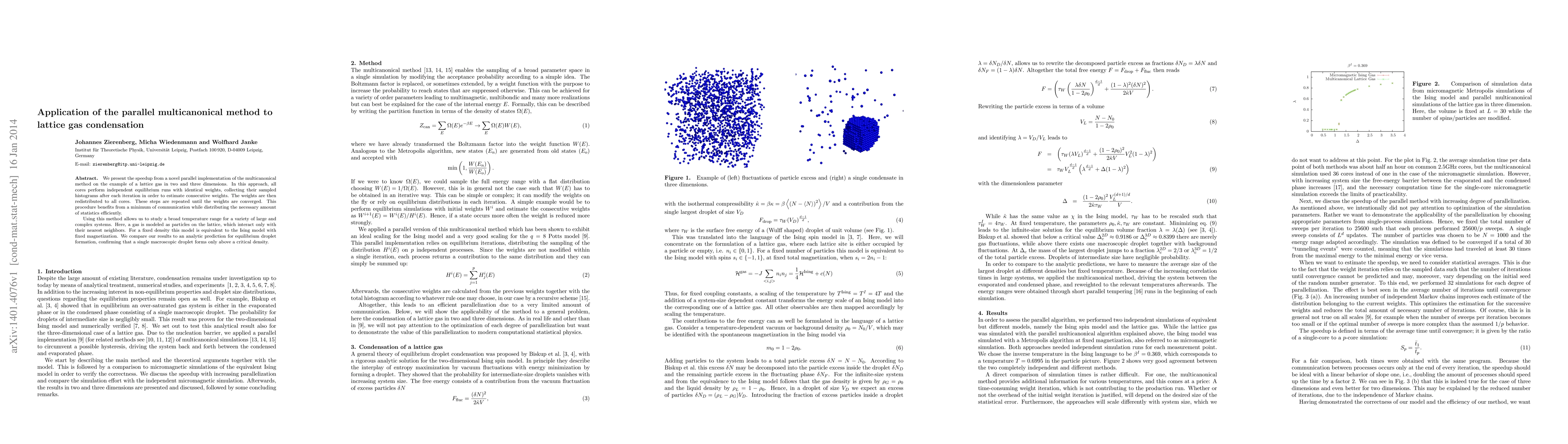 We present the speedup from a novel parallel implementation of the multicanonical method on the example of a lattice gas in two and three dimensions. In this approach, all cores perform independent equilibrium runs with identical weights, collecting their sampled histograms after each iteration in order to estimate consecutive weights. The weights are then redistributed to all cores. These steps are repeated until the weights are converged. This procedure benefits from a minimum of communication while distributing the necessary amount of statistics efficiently. Using this method allows us to study a broad temperature range for a variety of large and complex systems. Here, a gas is modeled as particles on the lattice, which interact only with their nearest neighbors. For a fixed density this model is equivalent to the Ising model with fixed magnetization. We compare our results to an analytic prediction for equilibrium droplet formation, confirming that a single macroscopic droplet forms only above a critical density.