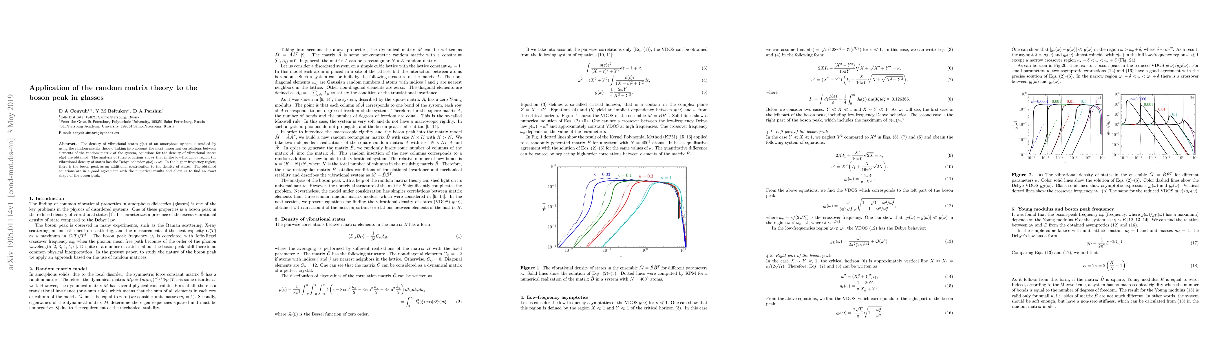 This paper applies random matrix theory to study the vibrational density of states in amorphous systems, revealing a Debye behavior at low frequencies and a boson peak at higher frequencies. The derived equations accurately match numerical results and precisely define the boson peak's shape.