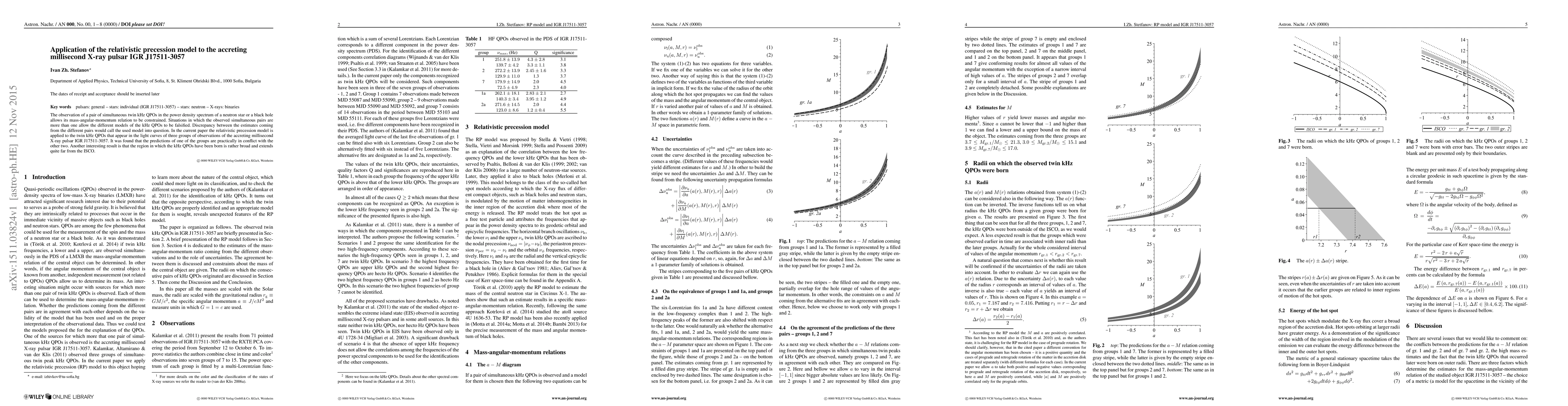 This paper applies the relativistic precession model to the kHz QPOs in the X-ray pulsar IGR J17511-3057, finding discrepancies among different observation groups. The results suggest that the model's predictions conflict across groups, indicating broader kHz QPO generation regions than previously expected.