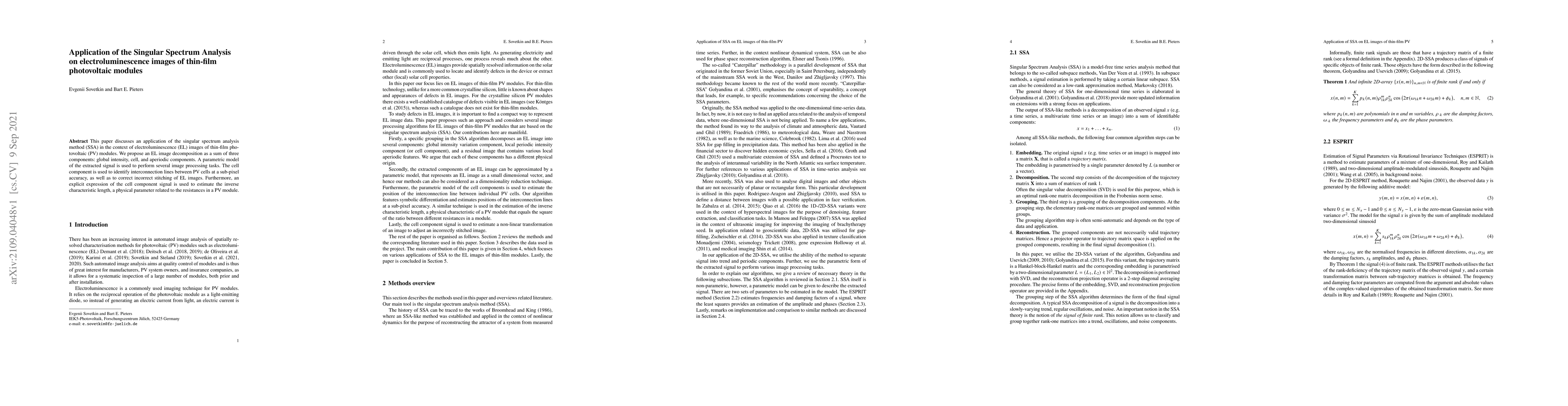 This paper discusses an application of the singular spectrum analysis method (SSA) in the context of electroluminescence (EL) images of thin-film photovoltaic (PV) modules. We propose an EL image decomposition as a sum of three components: global intensity, cell, and aperiodic components. A parametric model of the extracted signal is used to perform several image processing tasks. The cell component is used to identify interconnection lines between PV cells at sub-pixel accuracy, as well as to correct incorrect stitching of EL images. Furthermore, an explicit expression of the cell component signal is used to estimate the inverse characteristic length, a physical parameter related to the resistances in a PV module.