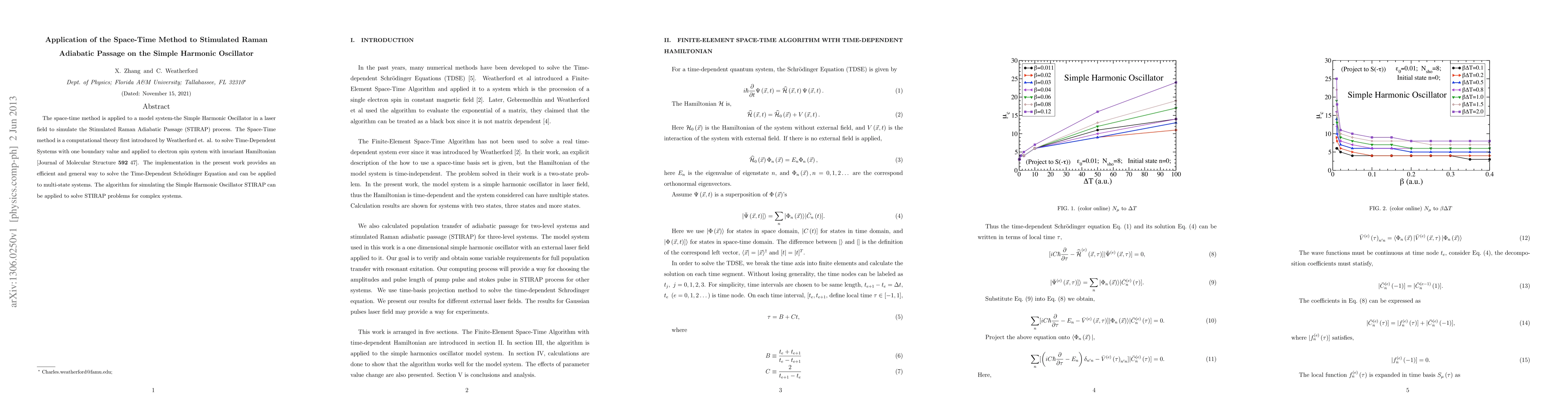 The paper applies the Space-Time method to the Simple Harmonic Oscillator in a laser field to simulate Stimulated Raman Adiabatic Passage (STIRAP). This method offers an efficient, general solution to the Time-Dependent Schrödinger Equation, potentially applicable to complex systems.