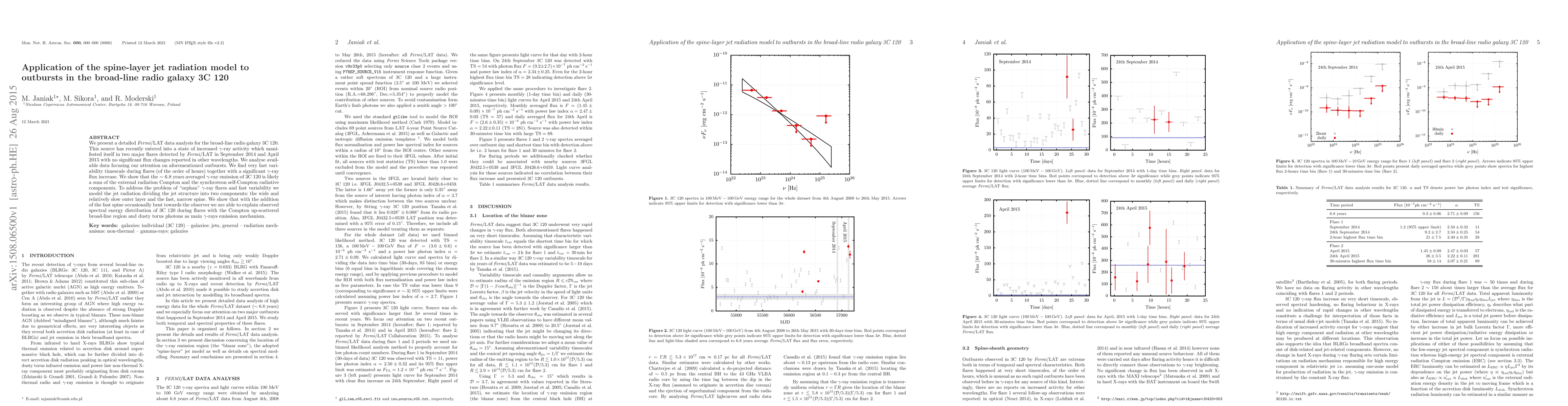 We present a detailed Fermi/LAT data analysis for the broad-line radio galaxy 3C 120. This source has recently entered into a state of increased gamma-ray activity which manifested itself in two major flares detected by Fermi/LAT in September 2014 and April 2015 with no significant flux changes reported in other wavelengths. We analyse available data focusing our attention on aforementioned outbursts. We find very fast variability timescale during flares (of the order of hours) together with a significant gamma-ray flux increase. We show that the 6.8 years averaged gamma-ray emission of 3C 120 is likely a sum of the external radiation Compton and the synchrotron self-Compton radiative components. To address the problem of "orphan" gamma-ray flares and fast variability we model the jet radiation dividing the jet structure into two components: the wide and relatively slow outer layer and the fast, narrow spine. We show that with the addition of the fast spine occasionally bent towards the observer we are able to explain observed spectral energy distribution of 3C 120 during flares with the Compton up-scattered broad-line region and dusty torus photons as main gamma-rays emission mechanism.
