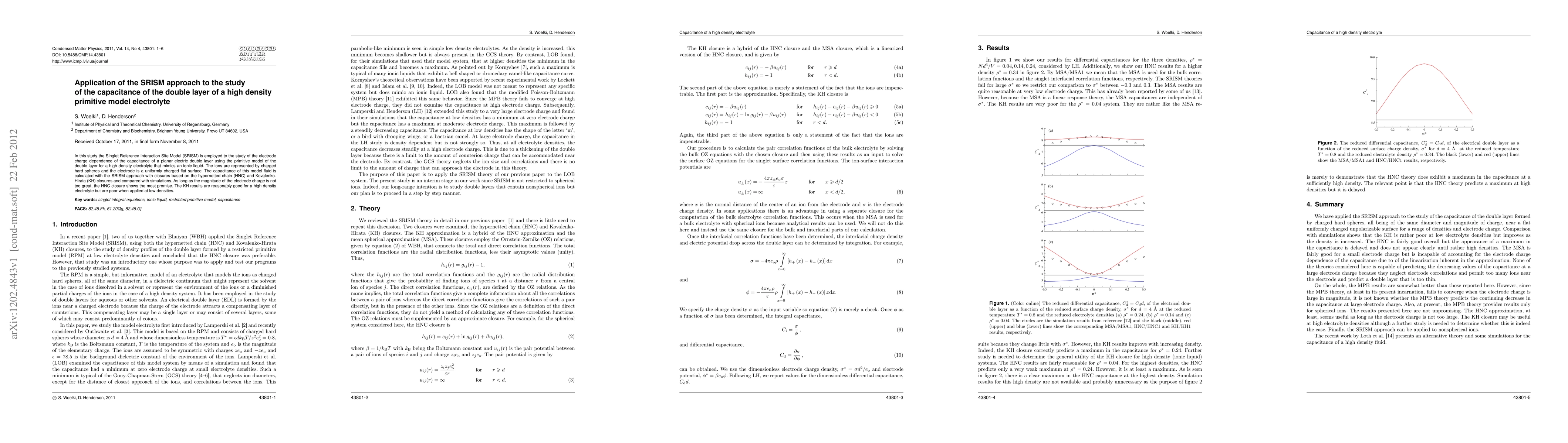 This paper applies the SRISM approach to investigate the capacitance of a high density primitive model electrolyte's double layer, comparing HNC and KH closures. The HNC closure shows the most promise for electrode charge dependence, while the KH closure performs well at high densities but poorly at low densities.