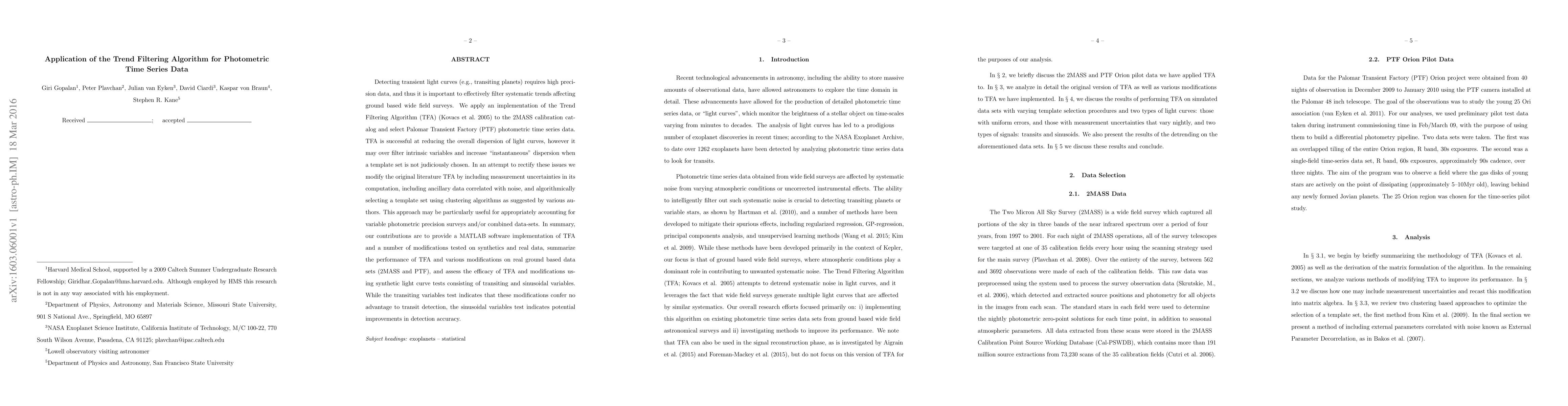 Detecting transient light curves (e.g., transiting planets) requires high precision data, and thus it is important to effectively filter systematic trends affecting ground based wide field surveys. We apply an implementation of the Trend Filtering Algorithm (TFA) (Kovacs et al. 2005) to the 2MASS calibration catalog and select Palomar Transient Factory (PTF) photometric time series data. TFA is successful at reducing the overall dispersion of light curves, however it may over filter intrinsic variables and increase "instantaneous" dispersion when a template set is not judiciously chosen. In an attempt to rectify these issues we modify the original literature TFA by including measurement uncertainties in its computation, including ancillary data correlated with noise, and algorithmically selecting a template set using clustering algorithms as suggested by various authors. This approach may be particularly useful for appropriately accounting for variable photometric precision surveys and/or combined data-sets. In summary, our contributions are to provide a MATLAB software implementation of TFA and a number of modifications tested on synthetics and real data, summarize the performance of TFA and various modifications on real ground based data sets (2MASS and PTF), and assess the efficacy of TFA and modifications using synthetic light curve tests consisting of transiting and sinusoidal variables. While the transiting variables test indicates that these modifications confer no advantage to transit detection, the sinusoidal variables test indicates potential improvements in detection accuracy.
