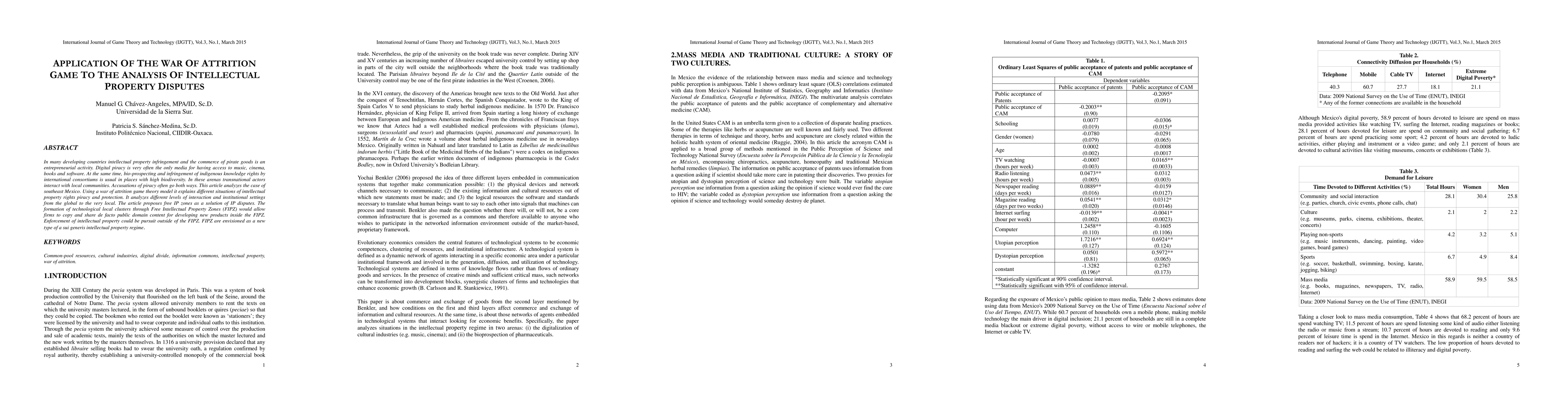 This paper applies war of attrition game theory to analyze intellectual property disputes in southeast Mexico, focusing on piracy and protection. It proposes Free Intellectual Property Zones (FIPZ) as a solution to IP conflicts, allowing local clusters to develop products using shared content within the FIPZ while enforcing IP rights outside.