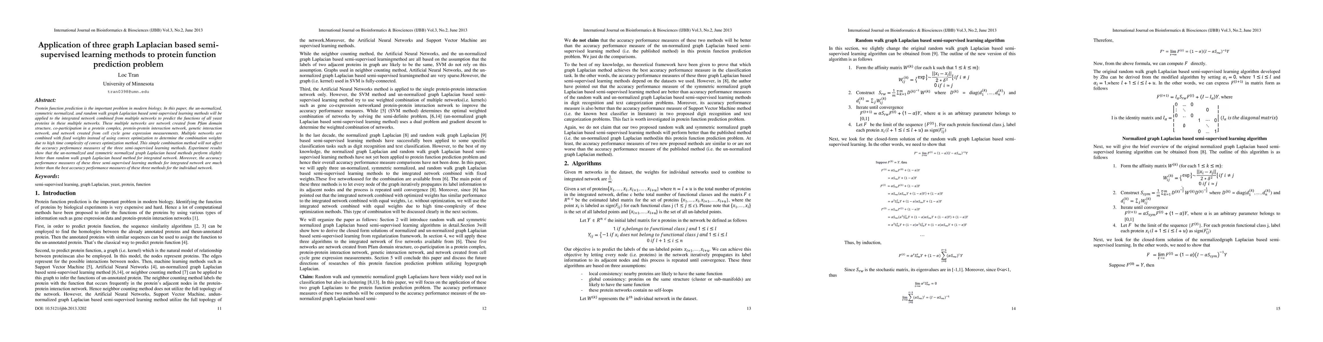 This paper applies three semi-supervised learning methods based on different graph Laplacians to predict yeast protein functions using an integrated network from multiple sources. The results show that un-normalized and symmetric normalized Laplacian methods outperform the random walk method, and all methods perform better on the integrated network than on individual networks.
