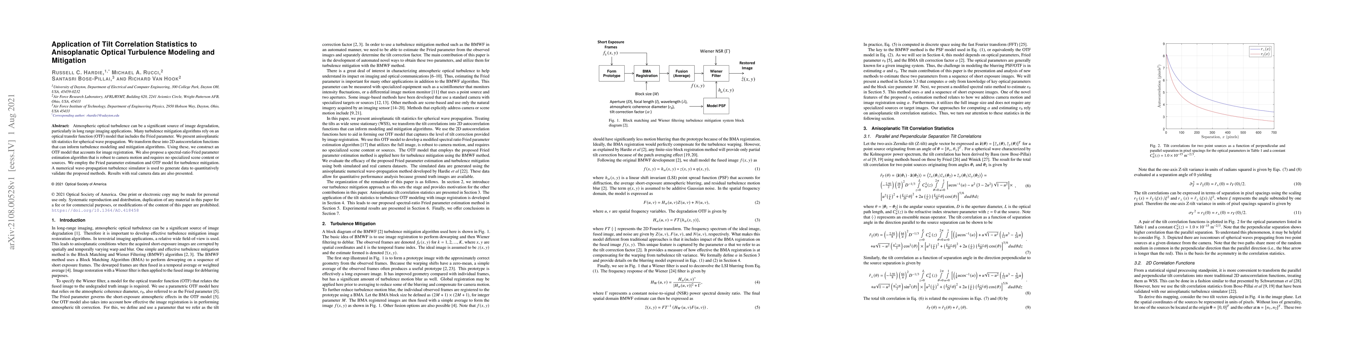 This paper presents anisoplanatic tilt correlation statistics for modeling and mitigating atmospheric optical turbulence, transforming them into 2D autocorrelation functions to improve turbulence modeling. It proposes a robust spectral-ratio Fried parameter estimation algorithm and validates the methods using both numerical simulations and real camera data.