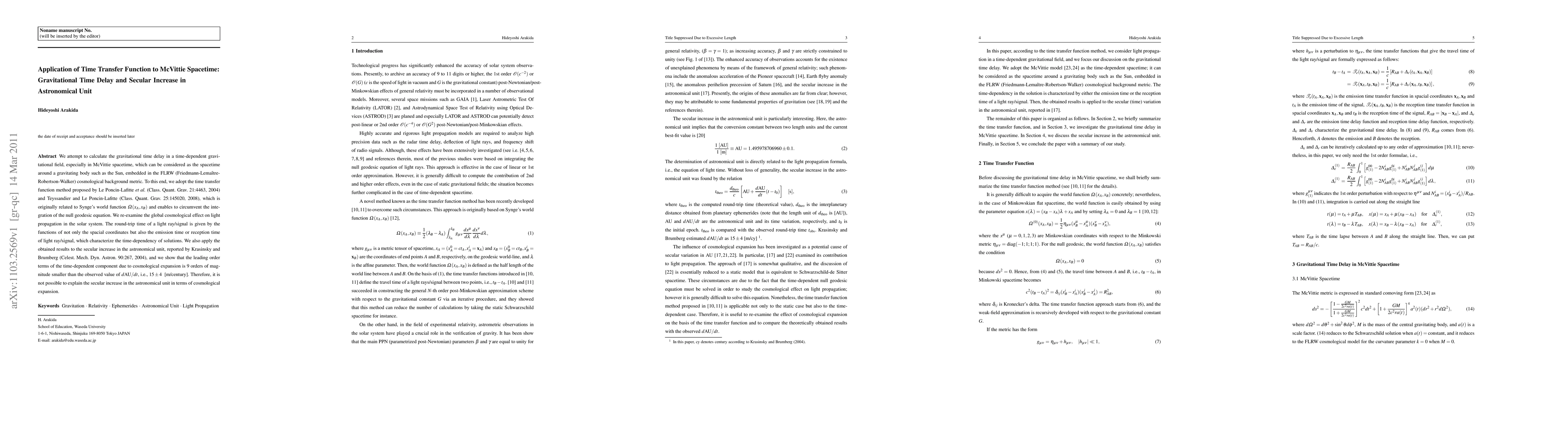 This paper calculates gravitational time delay in McVittie spacetime using the time transfer function method, finding negligible effects from cosmological expansion on the secular increase in the astronomical unit, which cannot explain the observed $d{\rm AU}/dt$.