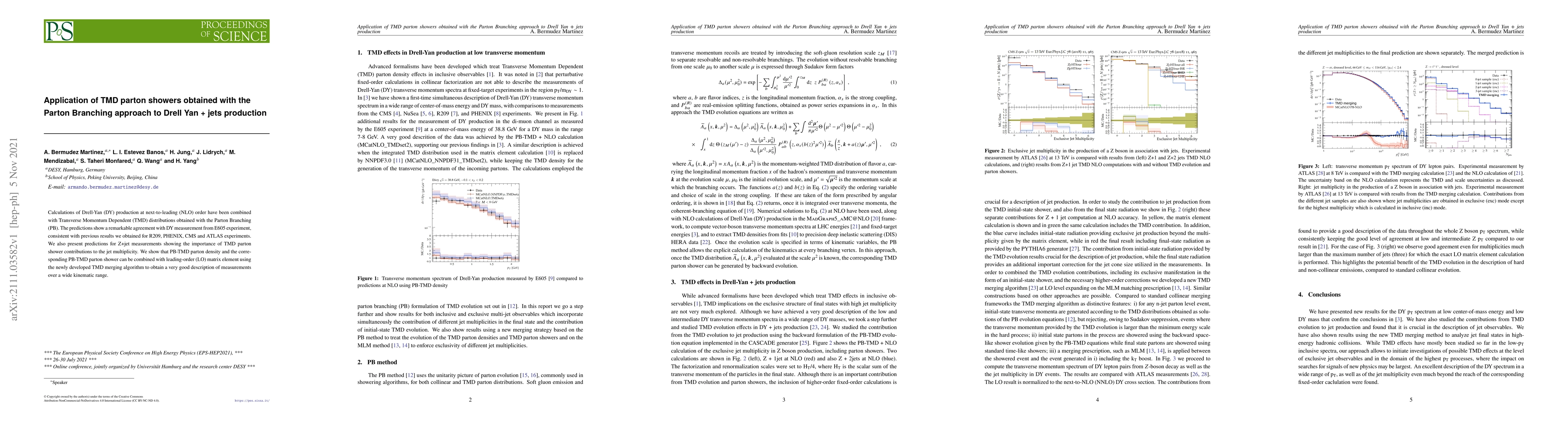 Calculations of Drell-Yan (DY) production at next-to-leading (NLO) order have been combined with Transverse Momentum Dependent (TMD) distributions obtained with the Parton Branching (PB). The predictions show a remarkable agreement with DY measurement from E605 experiment, consistent with previous results we obtained for R209, PHENIX, CMS and ATLAS experiments. We also present predictions for Z+jet measurements showing the importance of TMD parton shower contributions to the jet multiplicity. We show that PB-TMD parton density and the corresponding PB-TMD parton shower can be combined with leading-order (LO) matrix element using the newly developed TMD merging algorithm to obtain a very good description of measurements over a wide kinematic range.