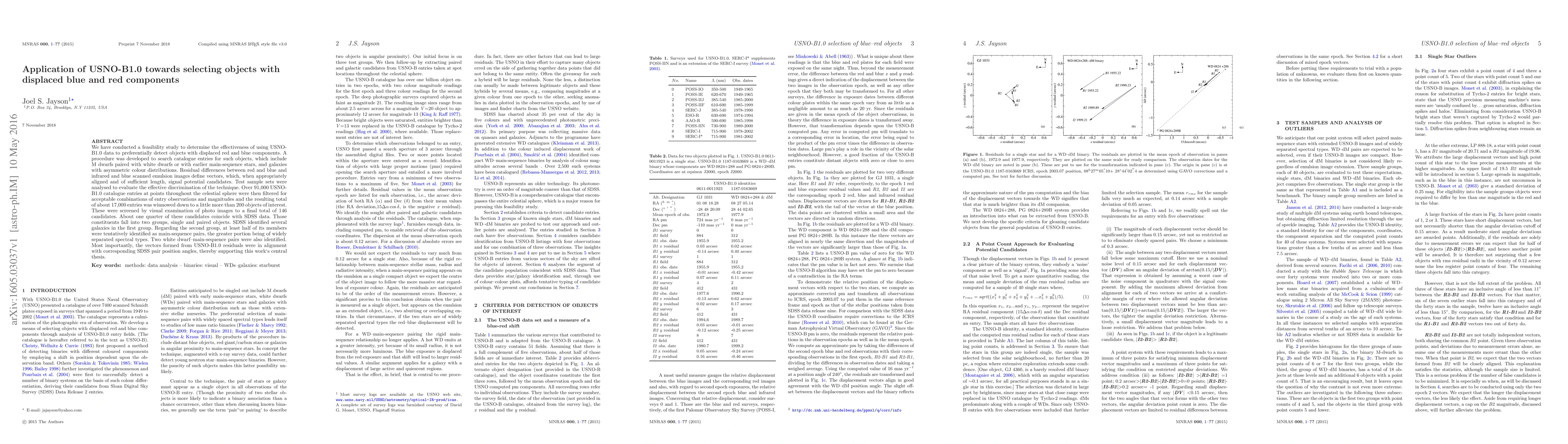 We have conducted a feasibility study to determine the effectiveness of using USNO-B1.0 data to preferentially detect objects with displaced red and blue components. A procedure was developed to search catalogue entries for such objects, which include M dwarfs paired with white dwarfs or with earlier main-sequence stars, and galaxies with asymmetric colour distributions. Residual differences between red and blue and infrared and blue scanned emulsion images define vectors, which, when appropriately aligned and of sufficient length, signal potential candidates. Test sample sets were analysed to evaluate the effective discrimination of the technique. Over 91,000 USNO-B1.0 catalogue entries at points throughout the celestial sphere were then filtered for acceptable combinations of entry observations and magnitudes and the resulting total of about 17,000 entries was winnowed down to a little more than 200 objects of interest. These were screened by visual examination of photo images to a final total of 146 candidates. About one quarter of these candidates coincide with SDSS data. Those constituents fall into two groups, single and paired objects. SDSS identified several galaxies in the first group. Regarding the second group, at least half of its members were tentatively identified as main-sequence pairs, the greater portion being of widely separated spectral types. Two white dwarf--main-sequence pairs were also identified. Most importantly, the vectors formed from USNO-B1.0 residuals were in alignment with corresponding SDSS pair position angles, thereby supporting this work`s central thesis.