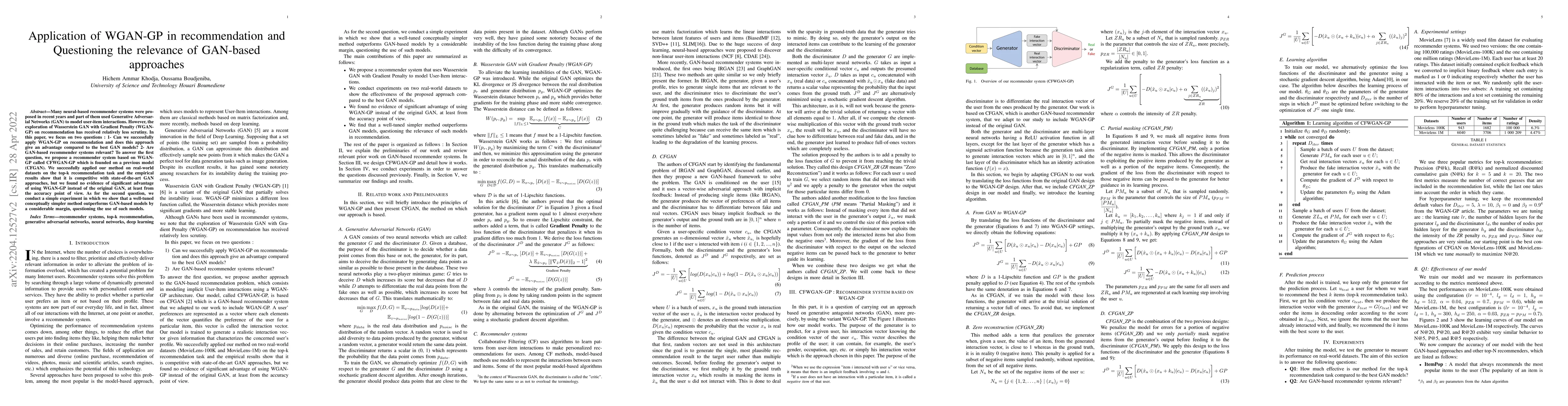 Many neural-based recommender systems were proposed in recent years and part of them used Generative Adversarial Networks (GAN) to model user-item interactions. However, the exploration of Wasserstein GAN with Gradient Penalty (WGAN-GP) on recommendation has received relatively less scrutiny. In this paper, we focus on two questions: 1- Can we successfully apply WGAN-GP on recommendation and does this approach give an advantage compared to the best GAN models? 2- Are GAN-based recommender systems relevant? To answer the first question, we propose a recommender system based on WGAN-GP called CFWGAN-GP which is founded on a previous model (CFGAN). We successfully applied our method on real-world datasets on the top-k recommendation task and the empirical results show that it is competitive with state-of-the-art GAN approaches, but we found no evidence of significant advantage of using WGAN-GP instead of the original GAN, at least from the accuracy point of view. As for the second question, we conduct a simple experiment in which we show that a well-tuned conceptually simpler method outperforms GAN-based models by a considerable margin, questioning the use of such models.