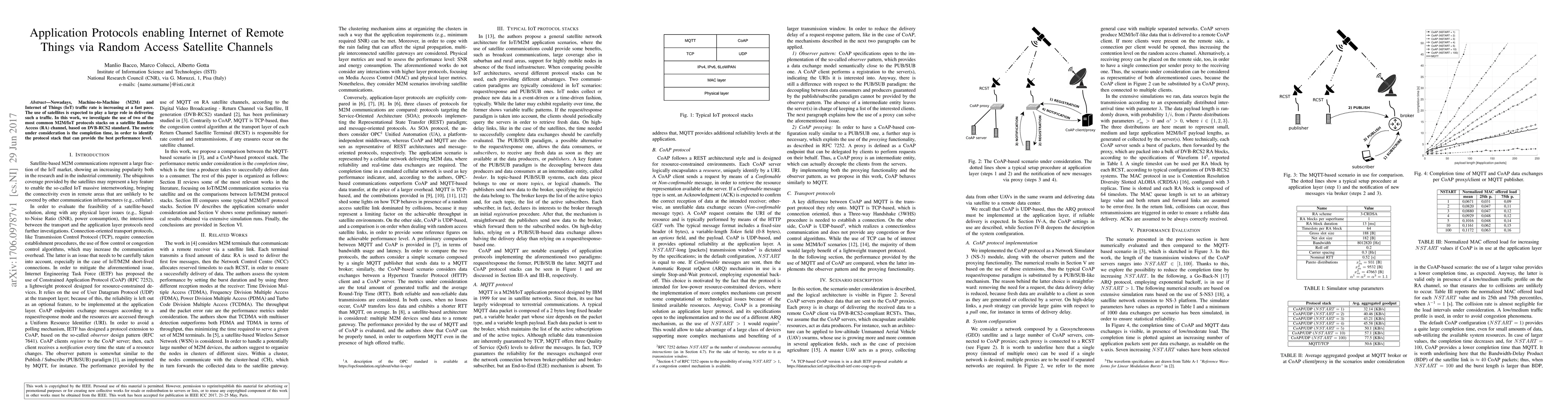 Nowadays, Machine-to-Machine (M2M) and Internet of Things (IoT) traffic rate is increasing at a fast pace. The use of satellites is expected to play a large role in delivering such a traffic. In this work, we investigate the use of two of the most common M2M/IoT protocols stacks on a satellite Random Access (RA) channel, based on DVB-RCS2 standard. The metric under consideration is the completion time, in order to identify the protocol stack that can provide the best performance level.