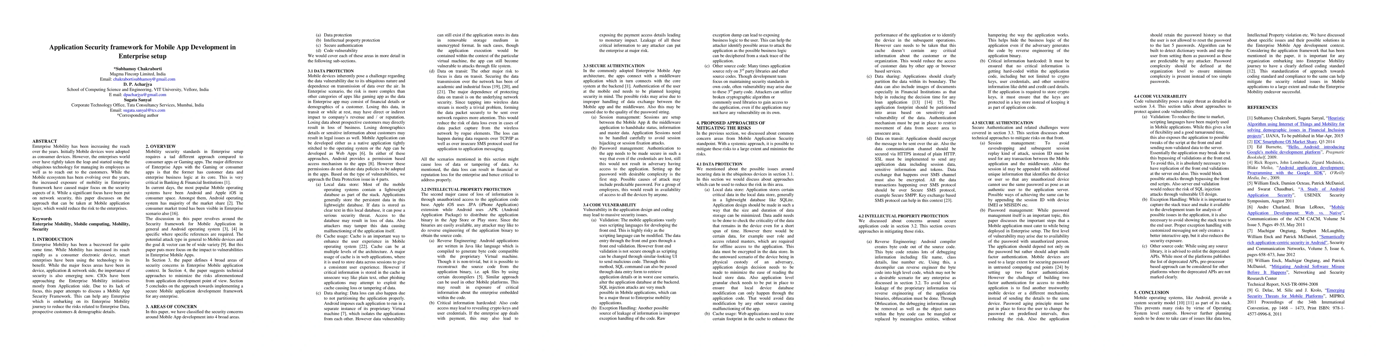 This paper proposes an application security framework for mobile app development in enterprise settings, emphasizing the need to mitigate risks at the mobile application layer to complement existing network security measures. The framework aims to enhance security in enterprise mobility by addressing vulnerabilities specific to mobile applications.
