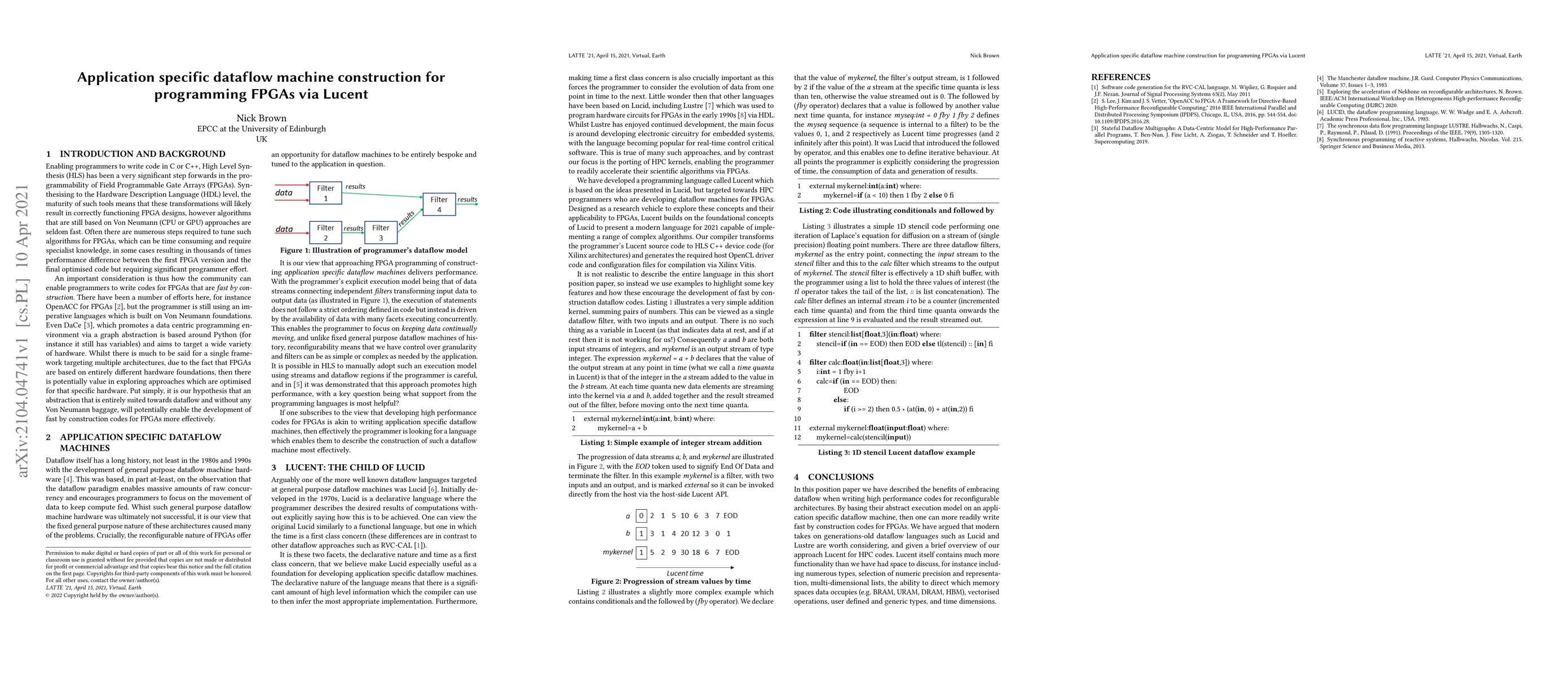 This paper proposes Lucent, a dataflow language for programming FPGAs, to improve programmer productivity and performance by leveraging dataflow abstractions. The authors argue that Lucent, inspired by 1970s and 1980s dataflow languages, can accelerate High Performance Computing (HPC) codes on FPGAs by enabling bespoke dataflow machine construction.