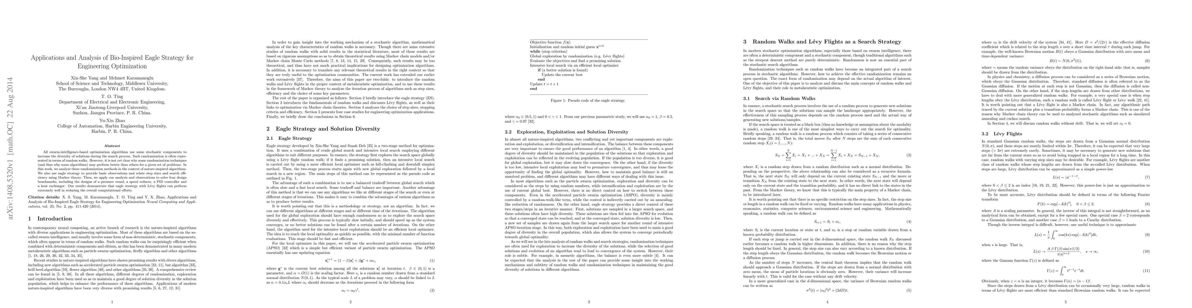 All swarm-intelligence-based optimization algorithms use some stochastic components to increase the diversity of solutions during the search process. Such randomization is often represented in terms of random walks. However, it is not yet clear why some randomization techniques (and thus why some algorithms) may perform better than others for a given set of problems. In this work, we analyze these randomization methods in the context of nature-inspired algorithms. We also use eagle strategy to provide basic observations and relate step sizes and search efficiency using Markov theory. Then, we apply our analysis and observations to solve four design benchmarks, including the designs of a pressure vessel, a speed reducer, a PID controller and a heat exchanger. Our results demonstrate that eagle strategy with L\'evy flights can perform extremely well in reducing the overall computational efforts.