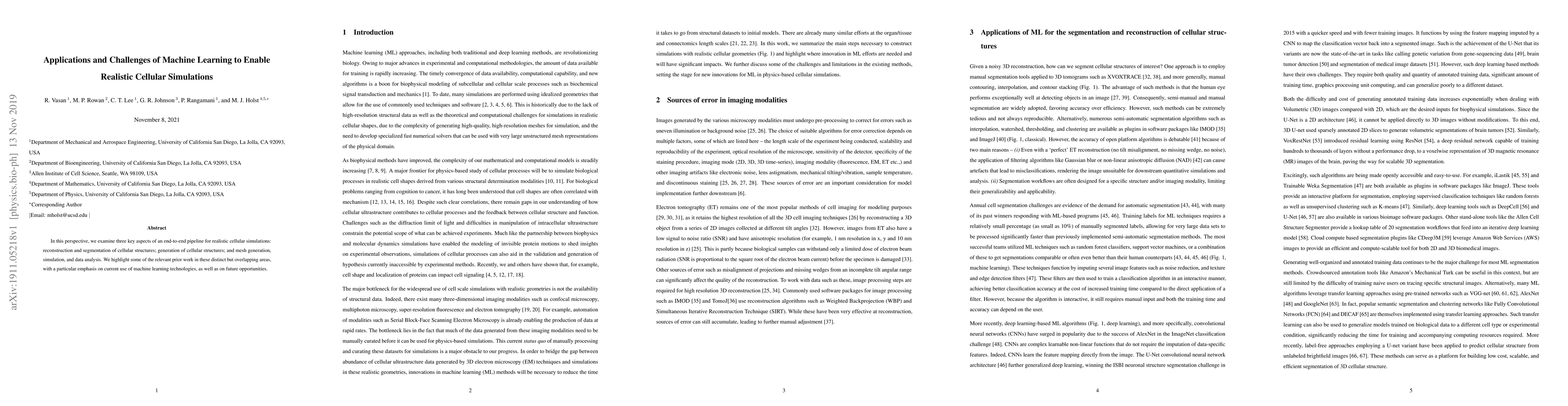 In this perspective, we examine three key aspects of an end-to-end pipeline for realistic cellular simulations: reconstruction and segmentation of cellular structures; generation of cellular structures; and mesh generation, simulation, and data analysis. We highlight some of the relevant prior work in these distinct but overlapping areas, with a particular emphasis on current use of machine learning technologies, as well as on future opportunities.