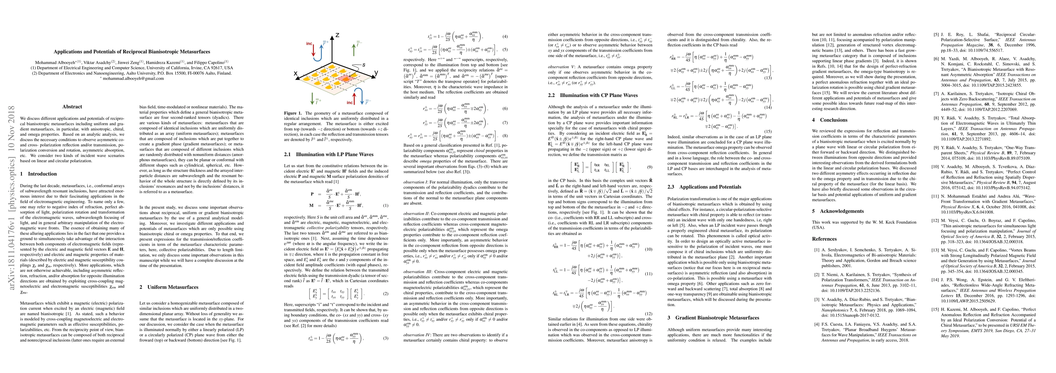 This paper explores the applications and potentials of reciprocal bianisotropic metasurfaces, focusing on uniform and gradient types with anisotropic, chiral, and omega properties. It analytically examines conditions for asymmetric polarization effects, including conversion, rotation, and absorption, under linear and circular polarized incident waves.