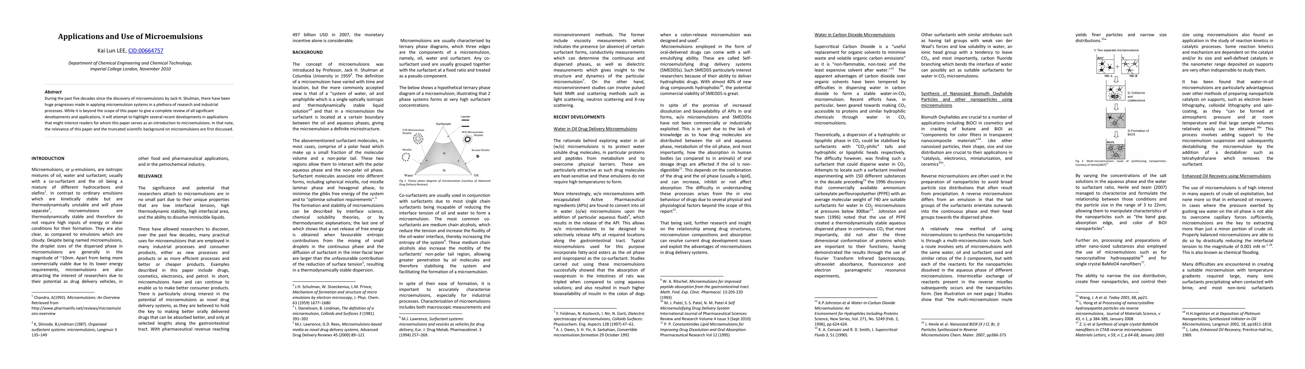 During the past five decades since the discovery of microemulsions by Jack H. Shulman, there have been huge progresses made in applying microemulsion systems in a plethora of research and industrial processes. While it is beyond the scope of this paper to give a complete review of all significant developments and applications, it will attempt to highlight several recent developments in applications that might interest readers for whom this paper serves as an introduction to microemulsions. In that note, the relevance of this paper and the truncated scientific background on microemulsions are first discussed.