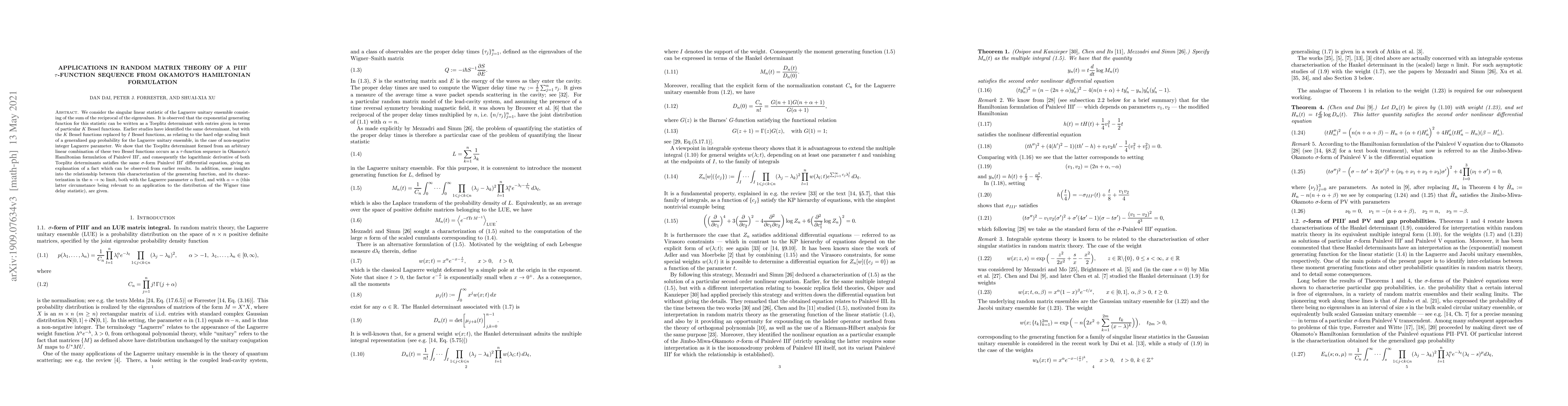 We consider the singular linear statistic of the Laguerre unitary ensemble consisting of the sum of the reciprocal of the eigenvalues. It is observed that the exponential generating function for this statistic can be written as a Toeplitz determinant with entries given in terms of particular $K$ Bessel functions. Earlier studies have identified the same determinant, but with the $K$ Bessel functions replaced by $I$ Bessel functions, as relating to the hard edge scaling limit of a generalized gap probability for the Laguerre unitary ensemble, in the case of non-negative integer Laguerre parameter. We show that the Toeplitz determinant formed from an arbitrary linear combination of these two Bessel functions occurs as a $\tau$-function sequence in Okamoto's Hamiltonian formulation of Painlev\'e III$'$, and consequently the logarithmic derivative of both Toeplitz determinants satisfies the same $\sigma$-form Painlev\'e III$'$ differential equation, giving an explanation of a fact which can be observed from earlier results. In addition, some insights into the relationship between this characterization of the generating function, and its characterization in the $n \to \infty$ limit, both with the Laguerre parameter $\alpha$ fixed, and with $\alpha = n$ (this latter circumstance being relevant to an application to the distribution of the Wigner time delay statistic), are given.