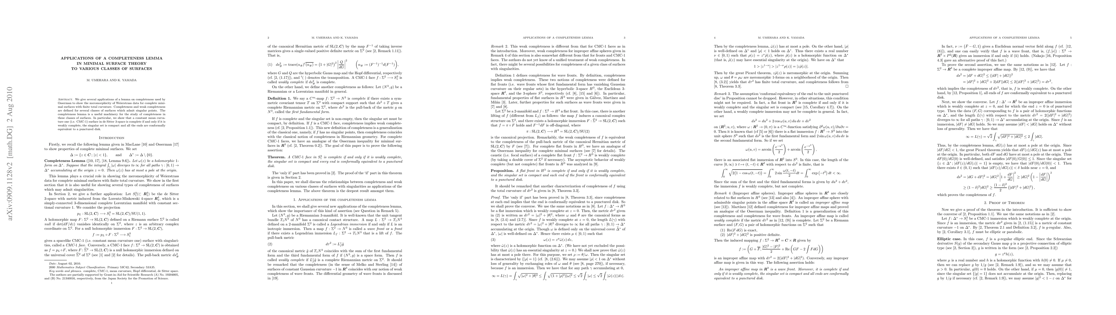 We give several applications of a lemma on completeness used by Osserman to show the meromorphicity of Weierstrass data for complete minimal surfaces with finite total curvature. Completeness and weak completeness are defined for several classes of surfaces which admit singular points. The completeness lemma is a useful machinery for the study of completeness in these classes of surfaces. In particular, we show that a constant mean curvature one (i.e. CMC-1) surface in de Sitter 3-space is complete if and only if it is weakly complete, the singular set is compact and all the ends are conformally equivalent to a puntured disk.