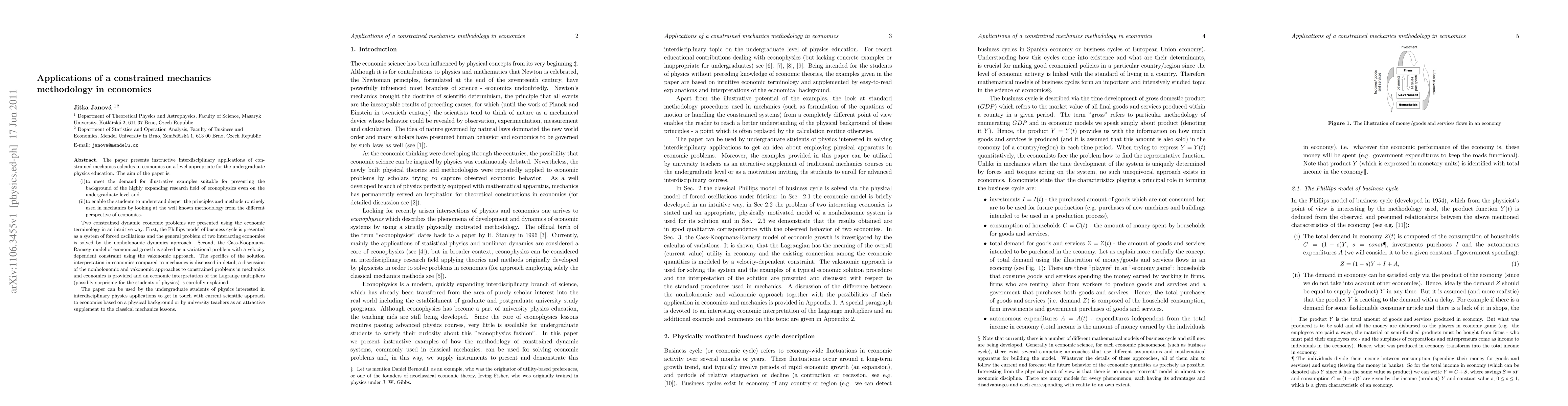 The paper presents instructive interdisciplinary applications of constrained mechanics calculus in economics on a level appropriate for the undergraduate physics education. The aim of the paper is: 1. to meet the demand for illustrative examples suitable for presenting the background of the highly expanding research field of econophysics even on the undergraduate level and 2. to enable the students to understand deeper the principles and methods routinely used in mechanics by looking at the well known methodology from the different perspective of economics. Two constrained dynamic economic problems are presented using the economic terminology in an intuitive way. First, the Phillips model of business cycle is presented as a system of forced oscillations and the general problem of two interacting economies is solved by the nonholonomic dynamics approach. Second, the Cass-Koopmans-Ramsey model of economical growth is solved as a variational problem with a velocity dependent constraint using the vakonomic approach. The specifics of the solution interpretation in economics compared to mechanics is discussed in detail, a discussion of the nonholonomic and vakonomic approaches to constrained problems in mechanics and economics is provided and an economic interpretation of the Lagrange multipliers (possibly surprising for the students of physics) is carefully explained. The paper can be used by the undergraduate students of physics interested in interdisciplinary physics applications to get in touch with current scientific approach to economics based on a physical background or by university teachers as an attractive supplement to the classical mechanics lessons.