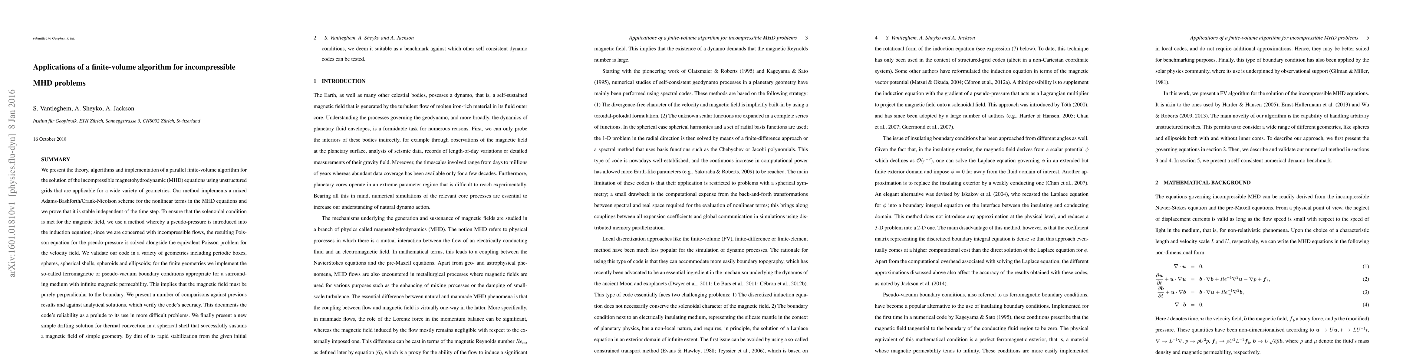 We present the theory, algorithms and implementation of a parallel finite-volume algorithm for the solution of the incompressible magnetohydrodynamic (MHD) equations using unstructured grids that are applicable for a wide variety of geometries. Our method implements a mixed Adams-Bashforth/Crank-Nicolson scheme for the nonlinear terms in the MHD equations and we prove that it is stable independent of the time step. To ensure that the solenoidal condition is met for the magnetic field, we use a method whereby a pseudo-pressure is introduced into the induction equation; since we are concerned with incompressible flows, the resulting Poisson equation for the pseudo-pressure is solved alongside the equivalent Poisson problem for the velocity field. We validate our code in a variety of geometries including periodic boxes, spheres, spherical shells, spheroids and ellipsoids; for the finite geometries we implement the so-called ferromagnetic or pseudo-vacuum boundary conditions appropriate for a surrounding medium with infinite magnetic permeability. This implies that the magnetic field must be purely perpendicular to the boundary. We present a number of comparisons against previous results and against analytical solutions, which verify the code's accuracy. This documents the code's reliability as a prelude to its use in more difficult problems. We finally present a new simple drifting solution for thermal convection in a spherical shell that successfully sustains a magnetic field of simple geometry. By dint of its rapid stabilization from the given initial conditions, we deem it suitable as a benchmark against which other self-consistent dynamo codes can be tested.