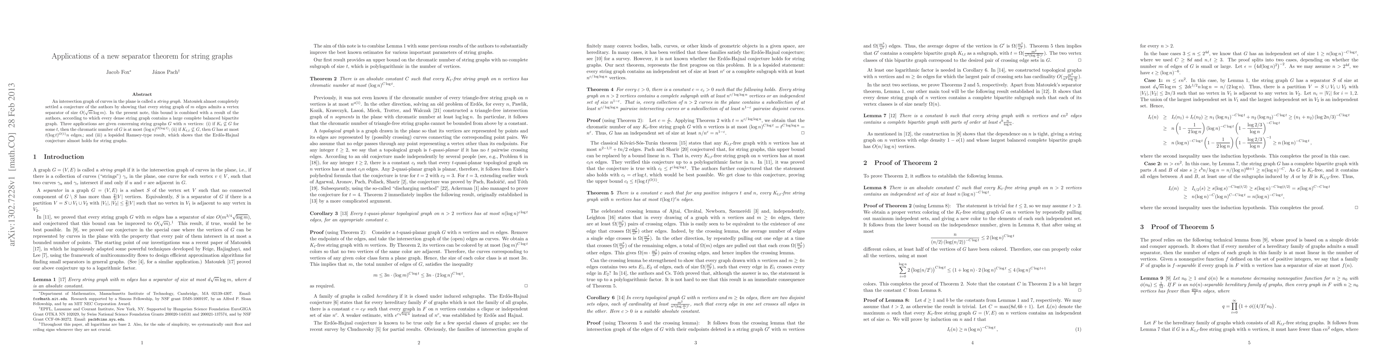 An intersection graph of curves in the plane is called a string graph. Matousek almost completely settled a conjecture of the authors by showing that every string graph of m edges admits a vertex separator of size O(\sqrt{m}\log m). In the present note, this bound is combined with a result of the authors, according to which every dense string graph contains a large complete balanced bipartite graph. Three applications are given concerning string graphs G with n vertices: (i) if K_t is not a subgraph of G for some t, then the chromatic number of G is at most (\log n)^{O(\log t)}; (ii) if K_{t,t} is not a subgraph of G, then G has at most t(\log t)^{O(1)}n edges,; and (iii) a lopsided Ramsey-type result, which shows that the Erdos-Hajnal conjecture almost holds for string graphs.