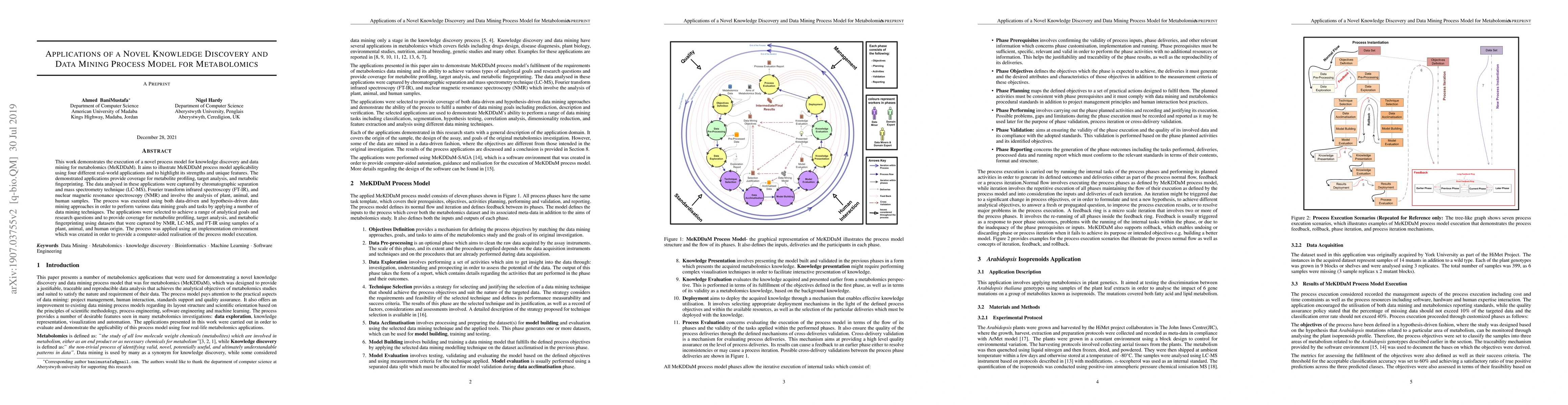 This work demonstrates the execution of a novel process model for knowledge discovery and data mining for metabolomics (MeKDDaM). It aims to illustrate MeKDDaM process model applicability using four different real-world applications and to highlight its strengths and unique features. The demonstrated applications provide coverage for metabolite profiling, target analysis, and metabolic fingerprinting. The data analysed in these applications were captured by chromatographic separation and mass spectrometry technique (LC-MS), Fourier transform infrared spectroscopy (FT-IR), and nuclear magnetic resonance spectroscopy (NMR) and involve the analysis of plant, animal, and human samples. The process was executed using both data-driven and hypothesis-driven data mining approaches in order to perform various data mining goals and tasks by applying a number of data mining techniques. The applications were selected to achieve a range of analytical goals and research questions and to provide coverage for metabolite profiling, target analysis, and metabolic fingerprinting using datasets that were captured by NMR, LC-MS, and FT-IR using samples of a plant, animal, and human origin. The process was applied using an implementation environment which was created in order to provide a computer-aided realisation of the process model execution.