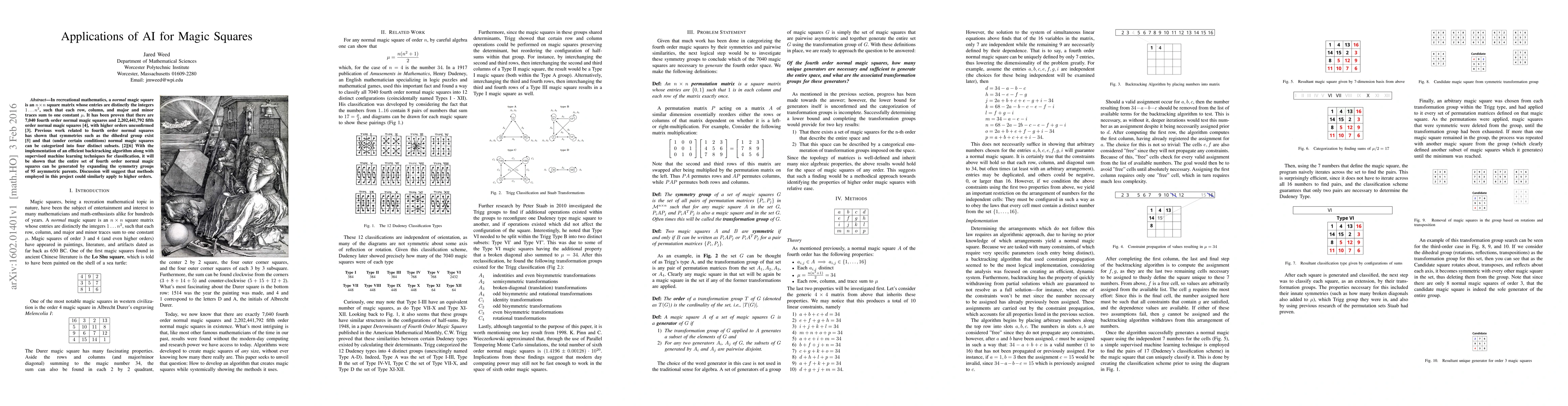 This paper explores the generation of fourth-order normal magic squares using AI techniques, demonstrating that 95 asymmetric parents can generate all 7,040 fourth-order squares through symmetry expansions. The study suggests potential applications of similar methods for higher-order magic squares.
