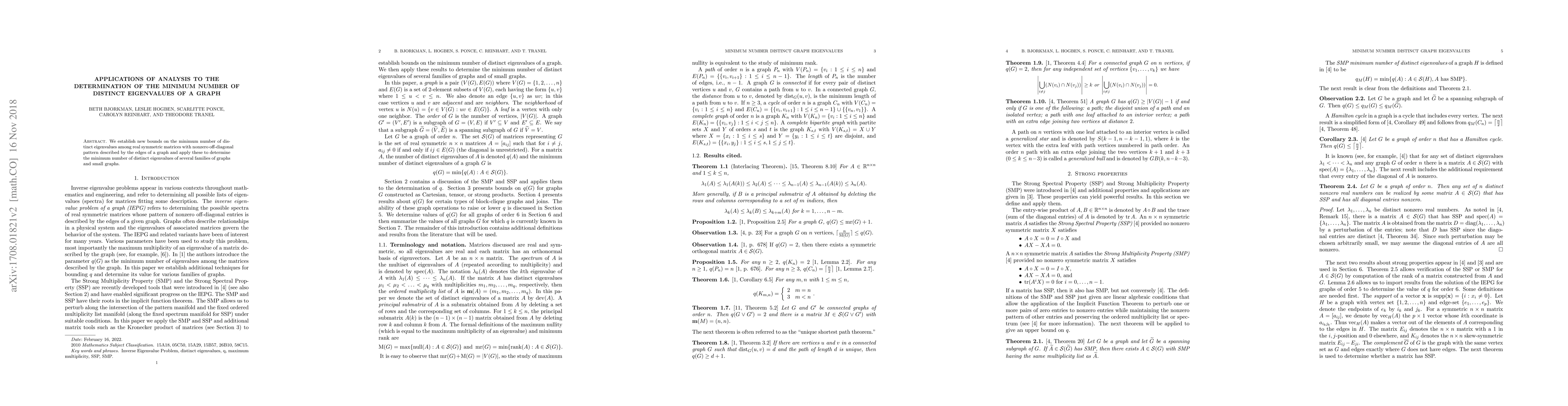 This paper establishes new bounds for the minimum number of distinct eigenvalues in real symmetric matrices based on the graph's edge structure, and applies these bounds to determine the minimum eigenvalues for various families and small graphs.