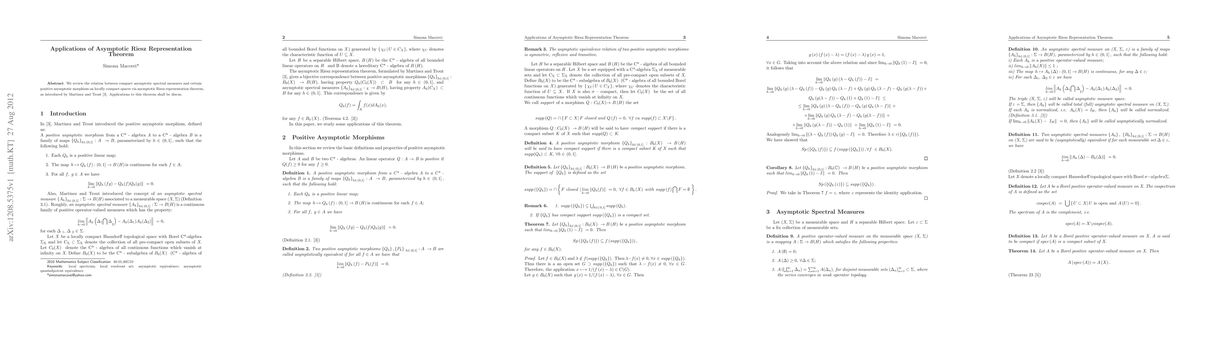 We review the relation between compact asymptotic spectral measures and certain positive asymptotic morphism on locally compact spaces via asymptotic Riesz representation theorem, as introduced by Martinez and Trout [3]. Applications to this theorem will be discus.