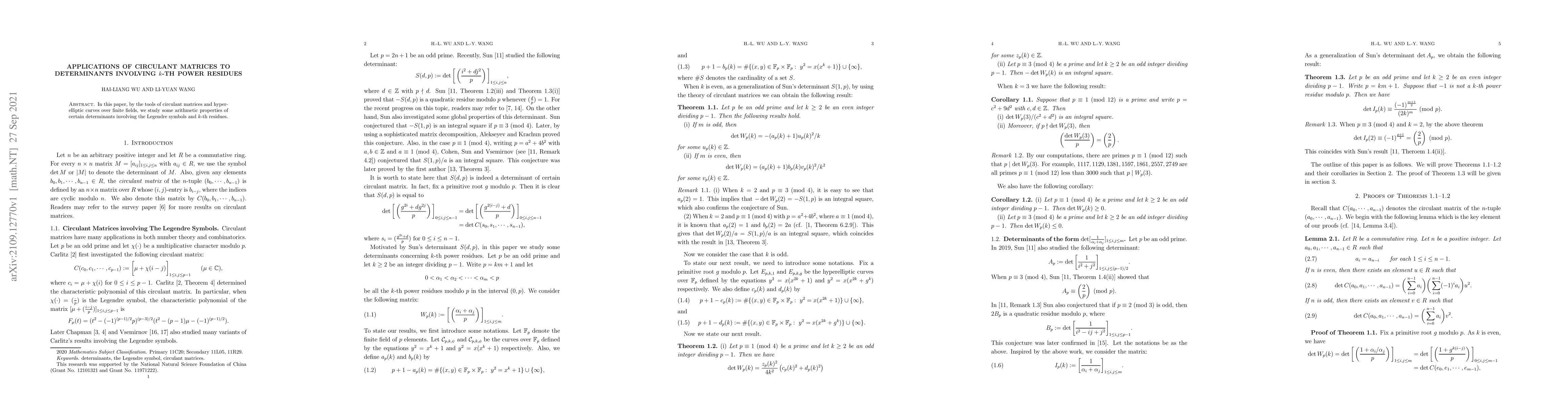 Summary: This paper explores arithmetic properties of determinants related to Legendre symbols and $k$-th power residues using circulant matrices and hyperelliptic curves over finite fields. The study leverages circulant matrices to simplify and analyze these determinants.
