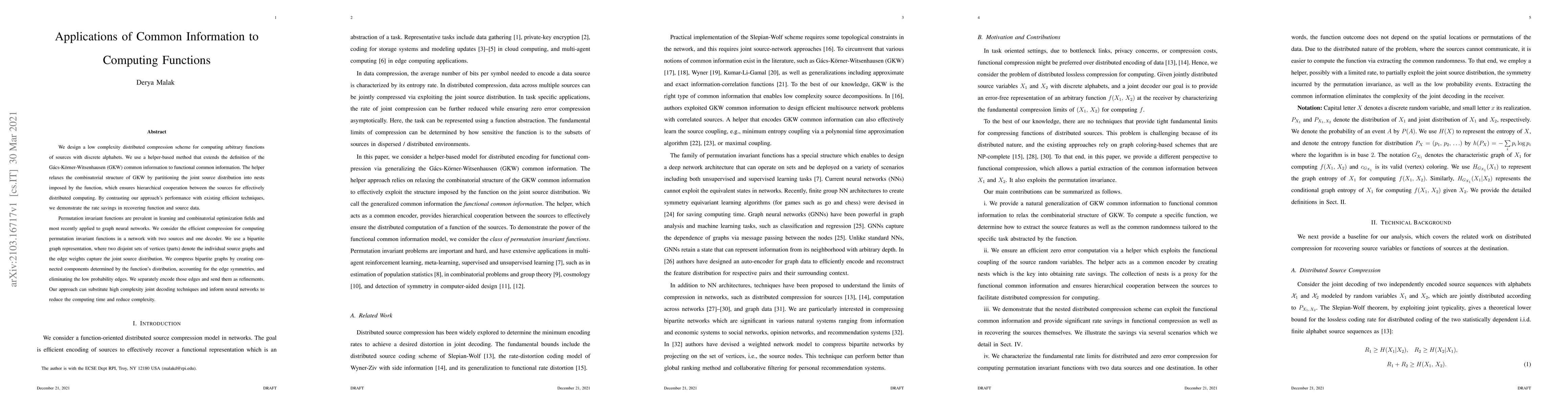 We design a low complexity distributed compression scheme for computing arbitrary functions of sources with discrete alphabets. We use a helper-based method that extends the definition of the G{\'a}cs-K{\"o}rner-Witsenhausen (GKW) common information to functional common information. The helper relaxes the combinatorial structure of GKW by partitioning the joint source distribution into nests imposed by the function, which ensures hierarchical cooperation between the sources for effectively distributed computing. By contrasting our approach's performance with existing efficient techniques, we demonstrate the rate savings in recovering function and source data. Permutation invariant functions are prevalent in learning and combinatorial optimization fields and most recently applied to graph neural networks. We consider the efficient compression for computing permutation invariant functions in a network with two sources and one decoder. We use a bipartite graph representation, where two disjoint sets of vertices (parts) denote the individual source graphs and the edge weights capture the joint source distribution. We compress bipartite graphs by creating connected components determined by the function's distribution, accounting for the edge symmetries, and eliminating the low probability edges. We separately encode those edges and send them as refinements. Our approach can substitute high complexity joint decoding techniques and inform neural networks to reduce the computing time and reduce complexity.