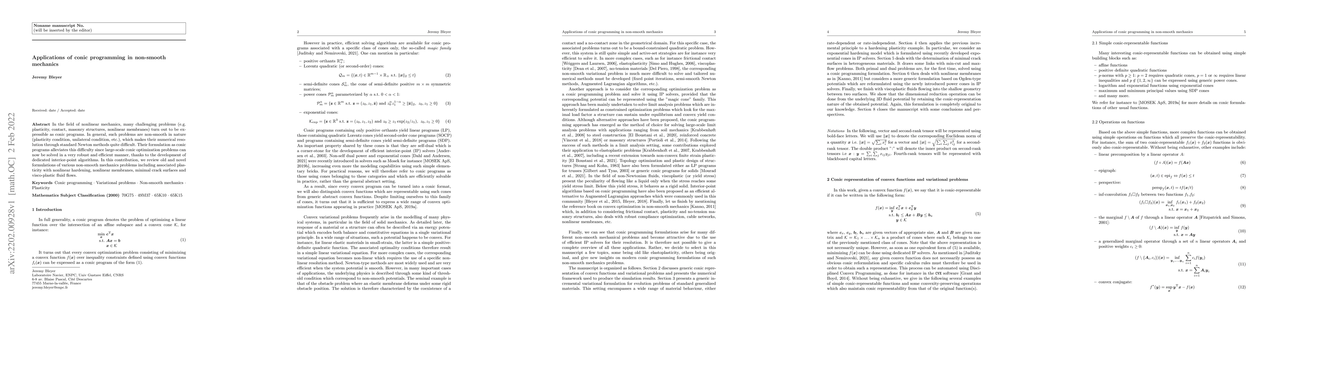 In the field of nonlinear mechanics, many challenging problems (e.g. plasticity, contact, masonry structures, nonlinear membranes) turn out to be expressible as conic programs. In general, such problems are non-smooth in nature (plasticity condition, unilateral condition, etc.), which makes their numerical resolution through standard Newton methods quite difficult. Their formulation as conic programs alleviates this difficulty since large-scale conic optimization problems can now be solved in a very robust and efficient manner, thanks to the development of dedicated interior-point algorithms. In this contribution, we review old and novel formulations of various non-smooth mechanics problems including associated plasticity with nonlinear hardening, nonlinear membranes, minimal crack surfaces and visco-plastic fluid flows.