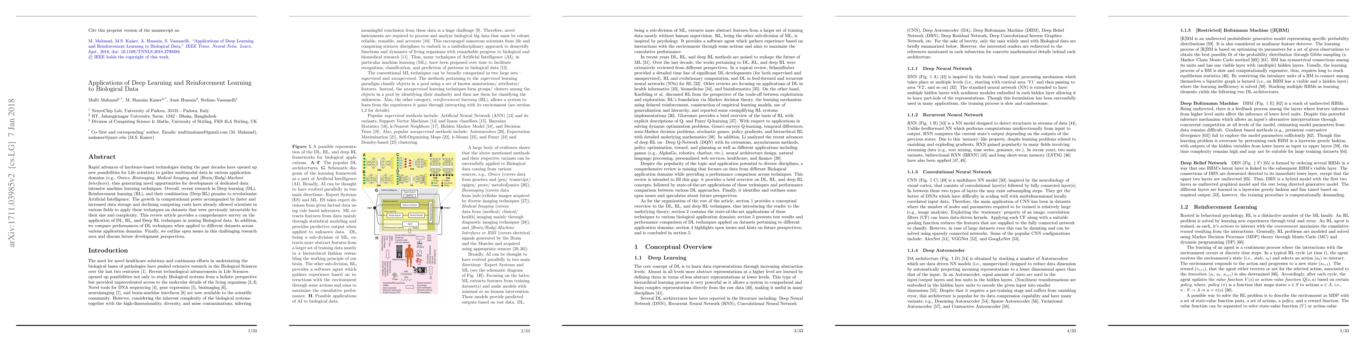 The paper provides a comprehensive survey on the application of Deep Learning (DL), Reinforcement Learning (RL), and their combination (Deep RL) in mining Biological data, comparing performances of DL techniques across various application domains such as Omics, Bioimaging, Medical Imaging, and [Brain/Body]-Machine Interfaces.
