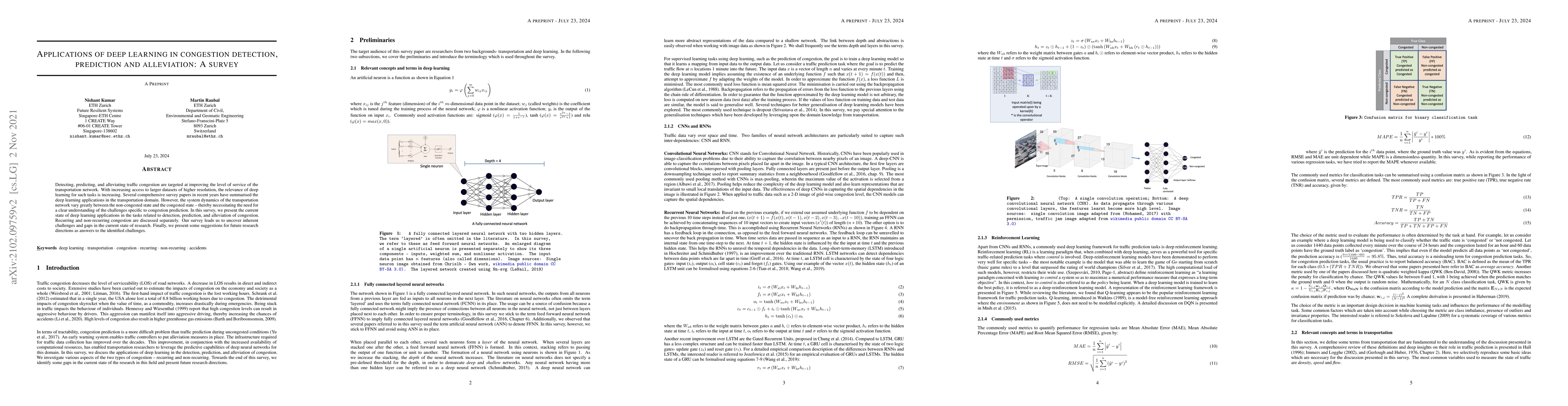 This survey reviews deep learning applications for traffic congestion detection, prediction, and alleviation, highlighting the challenges specific to congestion prediction and the differences between recurring and non-recurring congestion. It identifies gaps in current research and proposes future directions to address these challenges.