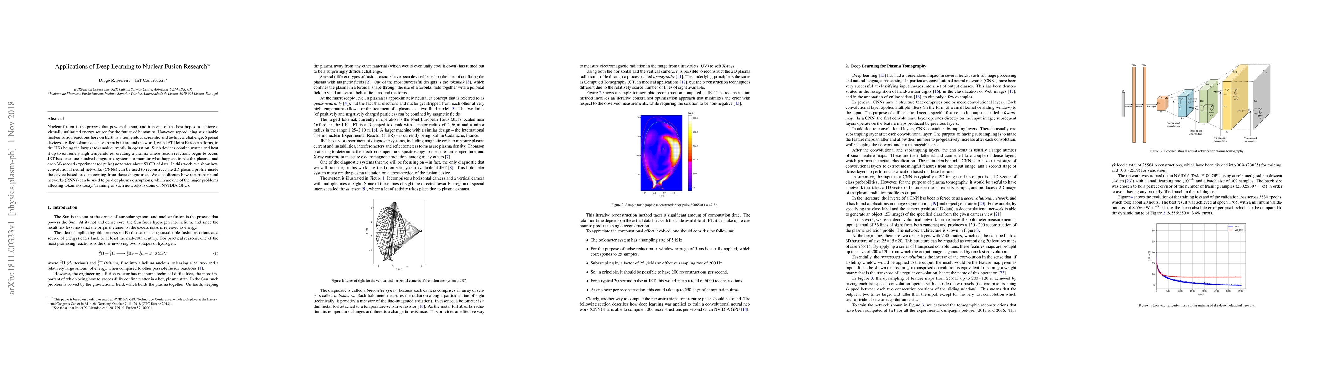 Nuclear fusion is the process that powers the sun, and it is one of the best hopes to achieve a virtually unlimited energy source for the future of humanity. However, reproducing sustainable nuclear fusion reactions here on Earth is a tremendous scientific and technical challenge. Special devices -- called tokamaks -- have been built around the world, with JET (Joint European Torus, in the UK) being the largest tokamak currently in operation. Such devices confine matter and heat it up to extremely high temperatures, creating a plasma where fusion reactions begin to occur. JET has over one hundred diagnostic systems to monitor what happens inside the plasma, and each 30-second experiment (or pulse) generates about 50 GB of data. In this work, we show how convolutional neural networks (CNNs) can be used to reconstruct the 2D plasma profile inside the device based on data coming from those diagnostics. We also discuss how recurrent neural networks (RNNs) can be used to predict plasma disruptions, which are one of the major problems affecting tokamaks today. Training of such networks is done on NVIDIA GPUs.