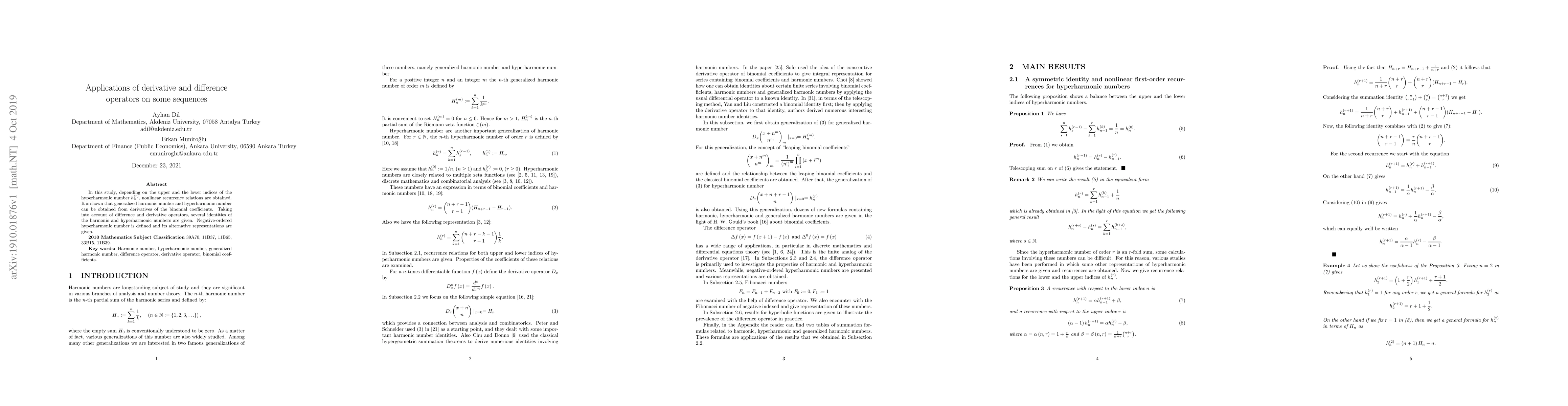 In this study, depending on the upper and the lower indices of the hyperharmonic number $h_{n}^{(r)}$, nonlinear recurrence relations are obtained. It is shown that generalized harmonic number and hyperharmonic number can be obtained from derivatives of the binomial coefficients. Taking into account of difference and derivative operators, several identities of the harmonic and hyperharmonic numbers are given. Negative-ordered hyperharmonic number is defined and its alternative representations are given.