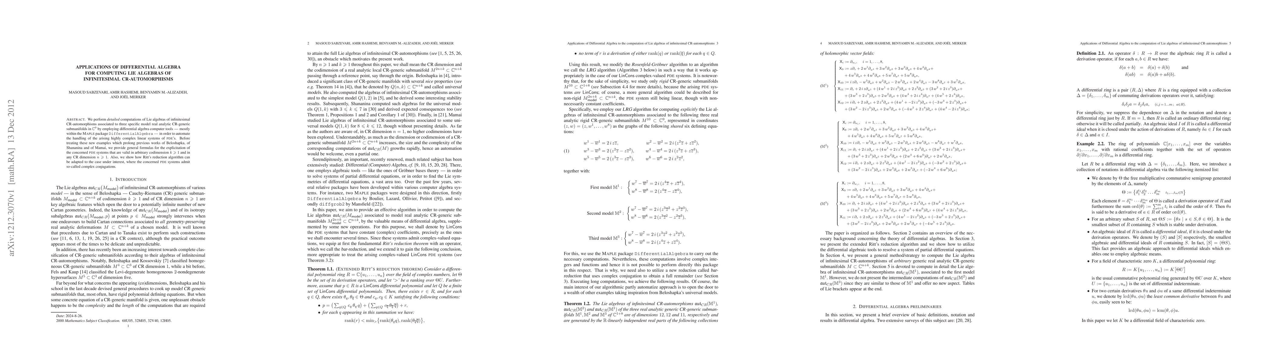 We perform detailed computations of Lie algebras of infinitesimal CR-automorphisms associated to three specific model real analytic CR-generic submanifolds in C^9 by employing differential algebra computer tools -- mostly within the Maple package DifferentialAlgebra -- in order to automate the handling of the arising highly complex linear systems of pde's. Before treating these new examples which prolong previous works of Beloshapka, of Shananina and of Mamai, we provide general formulas for the explicitation of the concerned pde systems that are valid in arbitrary codimension k >= 1 and in any CR dimension n >= 1. Also, we show how Ritt's reduction algorithm can be adapted to the case under interest, where the concerned pde systems admit so-called complex conjugations.