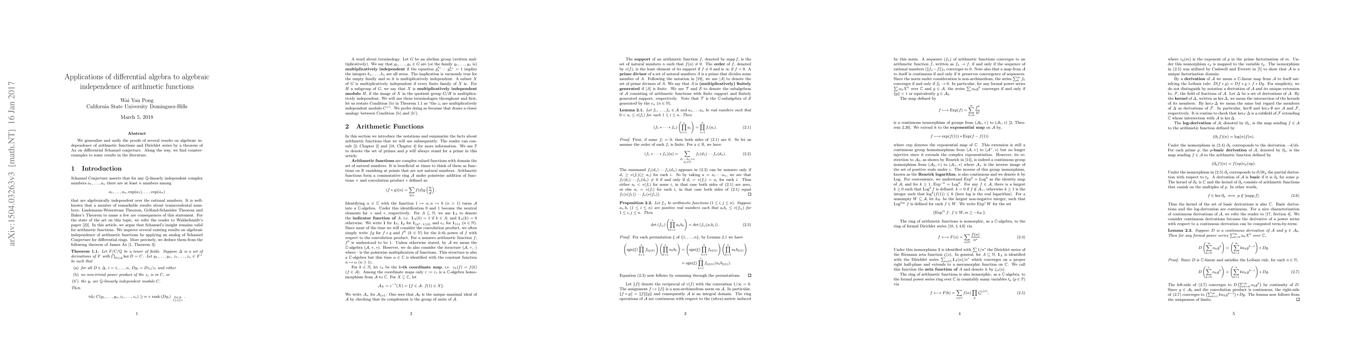 We generalize and unify the proofs of several results on algebraic in- dependence of arithmetic functions and Dirichlet series by a theorem of Ax on differential Schanuel conjecture. Along the way, we find counter-examples to some results in the literature.