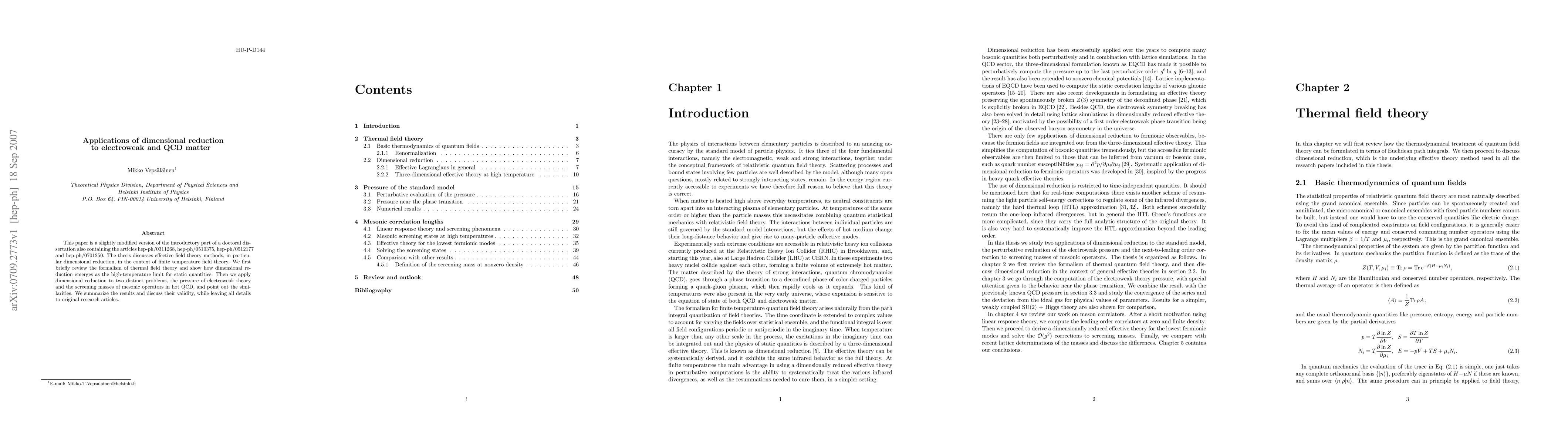 This paper is a slightly modified version of the introductory part of a doctoral dissertation also containing the articles hep-ph/0311268, hep-ph/0510375, hep-ph/0512177 and hep-ph/0701250. The thesis discusses effective field theory methods, in particular dimensional reduction, in the context of finite temperature field theory. We first briefly review the formalism of thermal field theory and show how dimensional reduction emerges as the high-temperature limit for static quantities. Then we apply dimensional reduction to two distinct problems, the pressure of electroweak theory and the screening masses of mesonic operators in hot QCD, and point out the similarities. We summarize the results and discuss their validity, while leaving all details to original research articles.