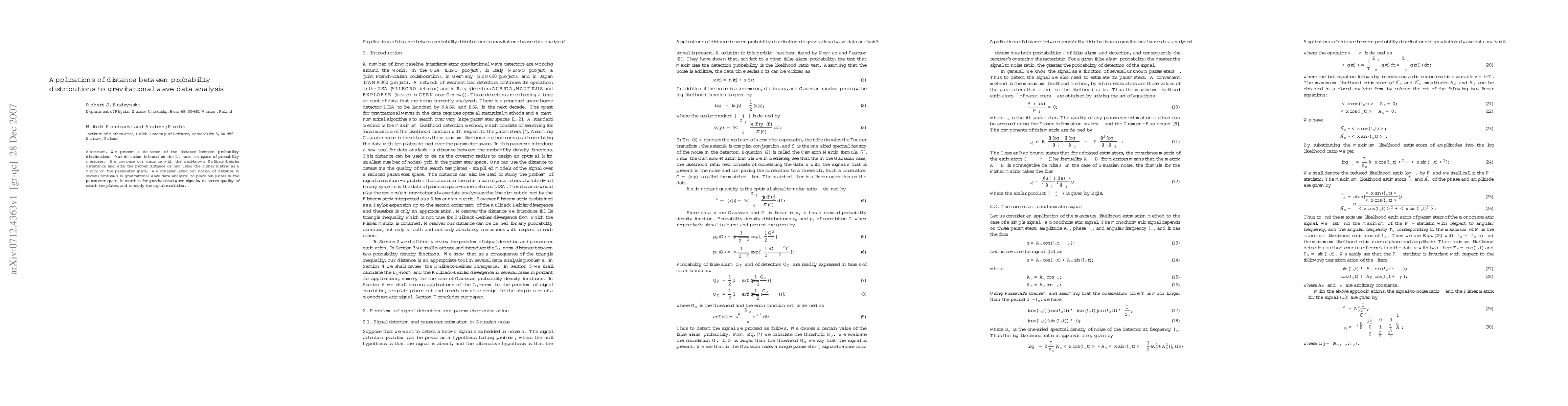This paper introduces a new method to measure distance between probability distributions using the L_1 norm, comparing it with existing measures like Kullback-Leibler divergence and Fisher matrix distance. The approach is applied to gravitational wave data analysis for improving signal detection and template placement.