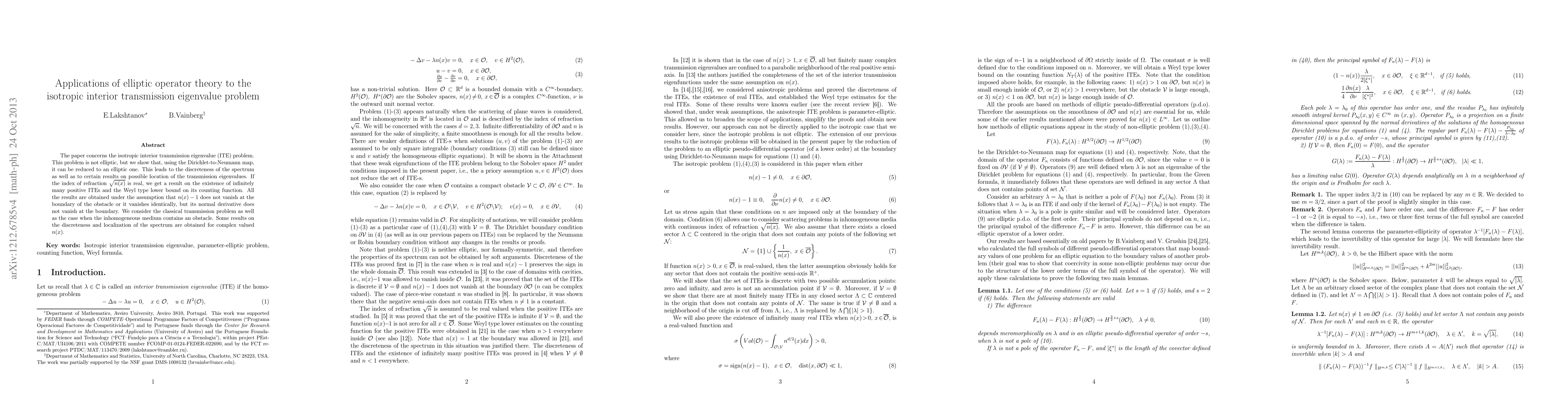 This paper applies elliptic operator theory to solve the isotropic interior transmission eigenvalue problem, demonstrating its reduction to an elliptic problem via the Dirichlet-to-Neumann map. It establishes the discreteness of the spectrum and provides results on the existence and localization of transmission eigenvalues under specific conditions on the index of refraction.