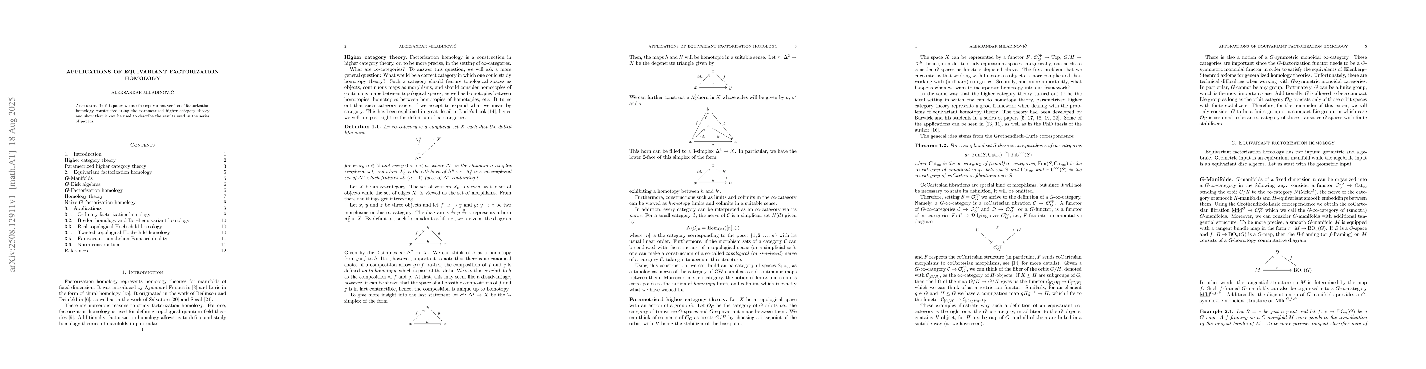 In this paper we use the equivariant version of factorization homology constructed using the parametrized higher category theory and show that it can be used to describe the results used in the series of papers.