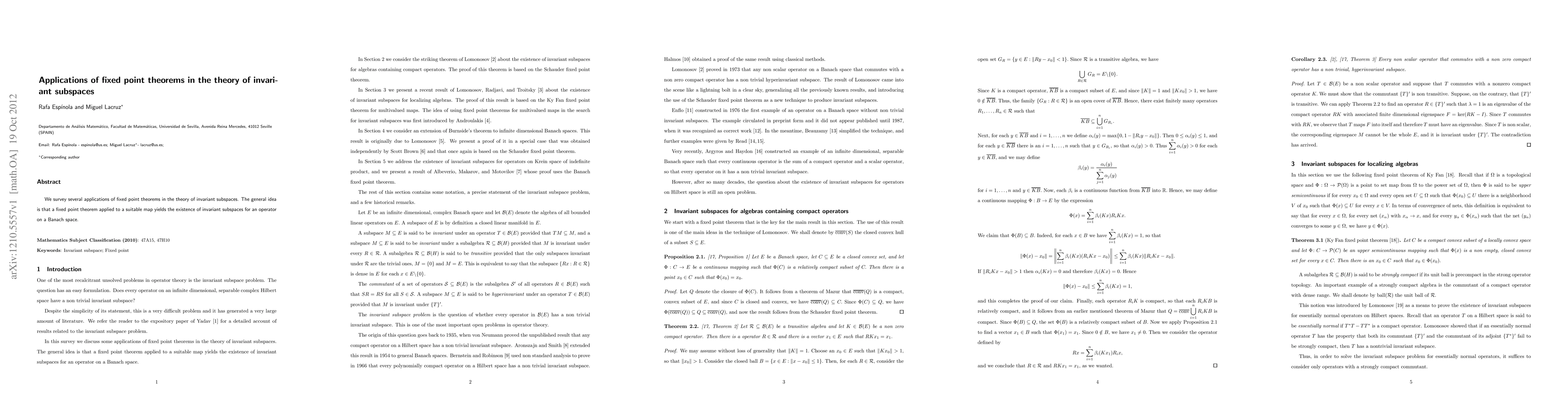 Summary: This paper surveys applications of fixed point theorems to establish the existence of invariant subspaces for operators on Banach spaces. It demonstrates how fixed point theorems applied to appropriate maps can yield significant results in the theory of invariant subspaces.