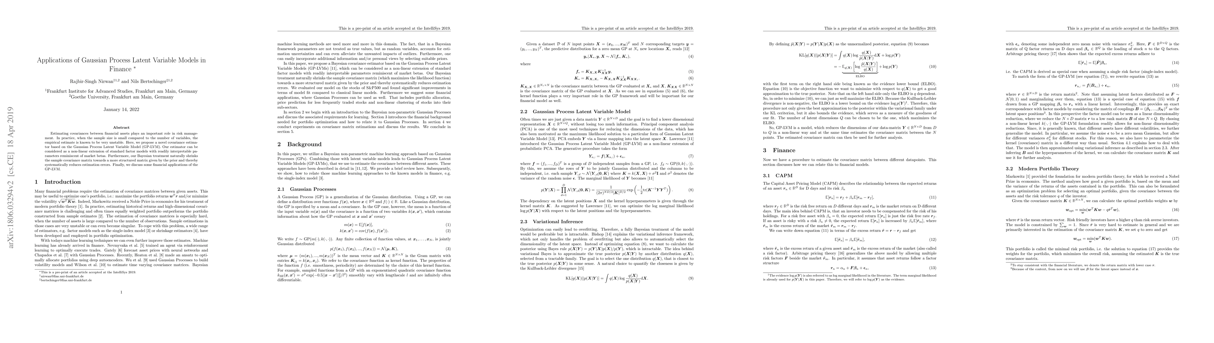 Estimating covariances between financial assets plays an important role in risk management. In practice, when the sample size is small compared to the number of variables, the empirical estimate is known to be very unstable. Here, we propose a novel covariance estimator based on the Gaussian Process Latent Variable Model (GP-LVM). Our estimator can be considered as a non-linear extension of standard factor models with readily interpretable parameters reminiscent of market betas. Furthermore, our Bayesian treatment naturally shrinks the sample covariance matrix towards a more structured matrix given by the prior and thereby systematically reduces estimation errors. Finally, we discuss some financial applications of the GP-LVM.